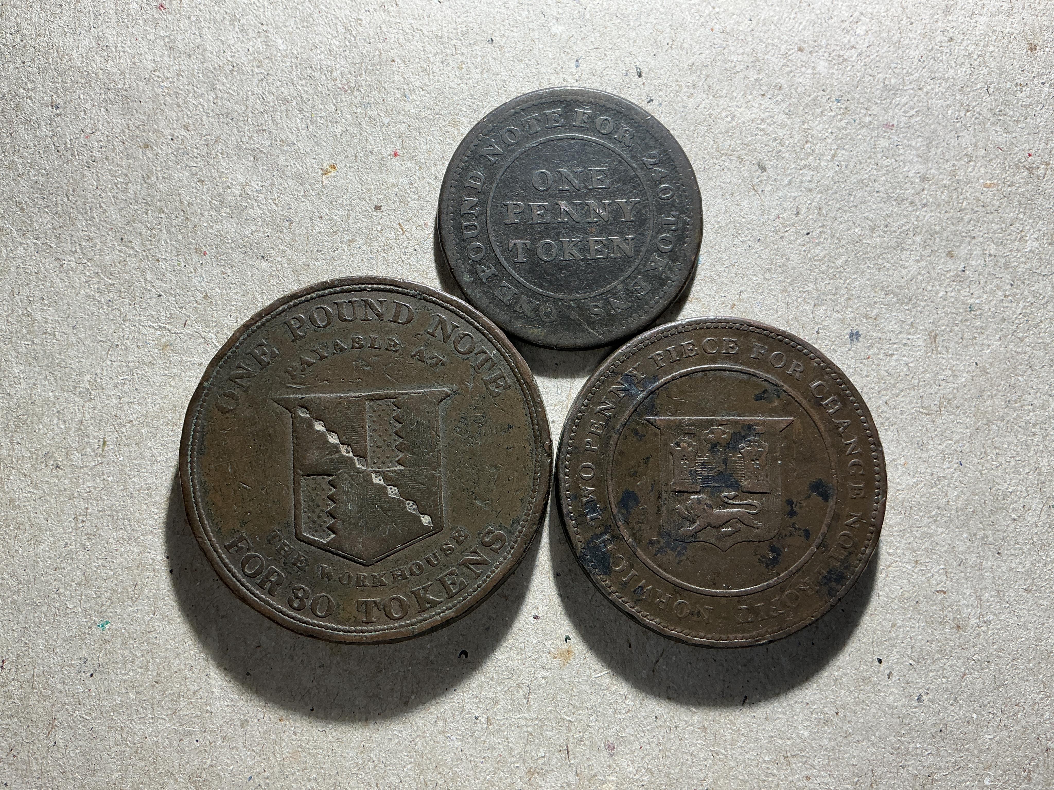 Comprising ten, one penny tokens, a Norwich twopence token and a Birmingham threepence token