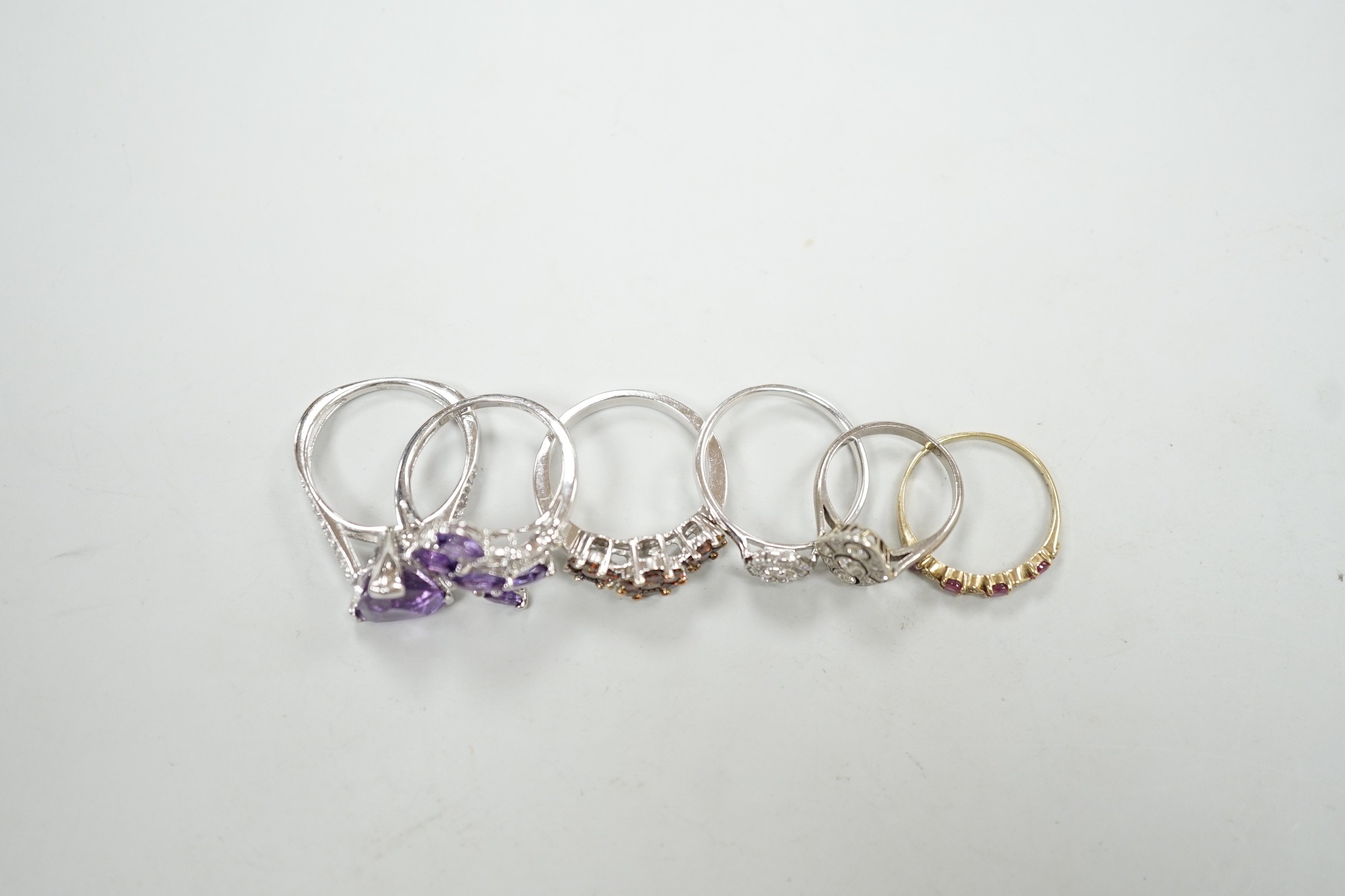 Five assorted modern 9ct gold and gem set dress rings, including diamond cluster ring, gross weight 14.2 grams, together with a 1920's style small white metal and millegrain set diamond cluster ring, size F/G, gross 2.6