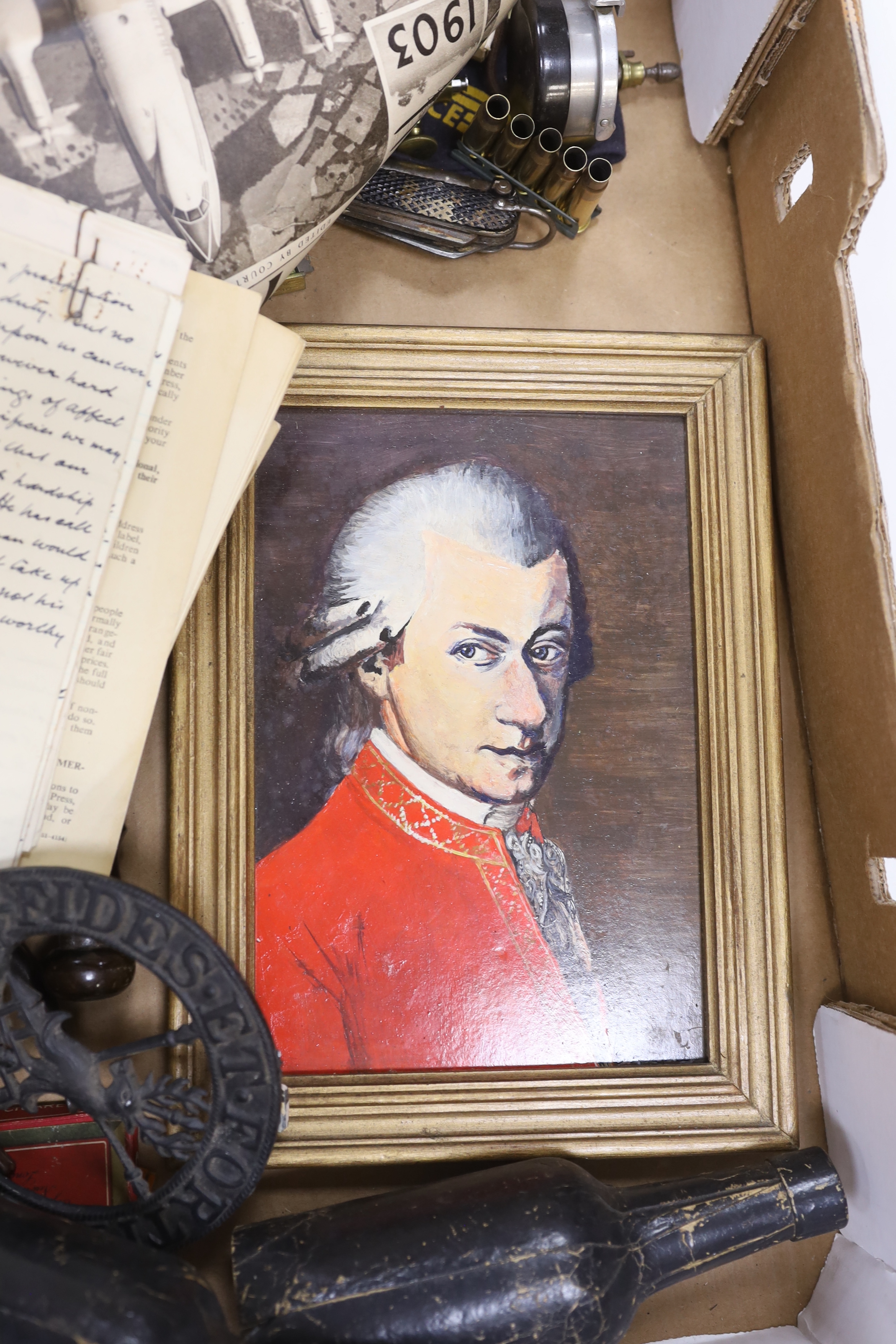 A collection of Militaria and other items, including a Royal Artillery brass cased timepiece, headphones, crepe paper bunting contained in a card Worthington’s IPA beer bottle, etc. Also including; Civil Defence leaflets, soldier’s discharge documents, a truncheon, a leather gun holster, mid-20th century hand held flags, etc.