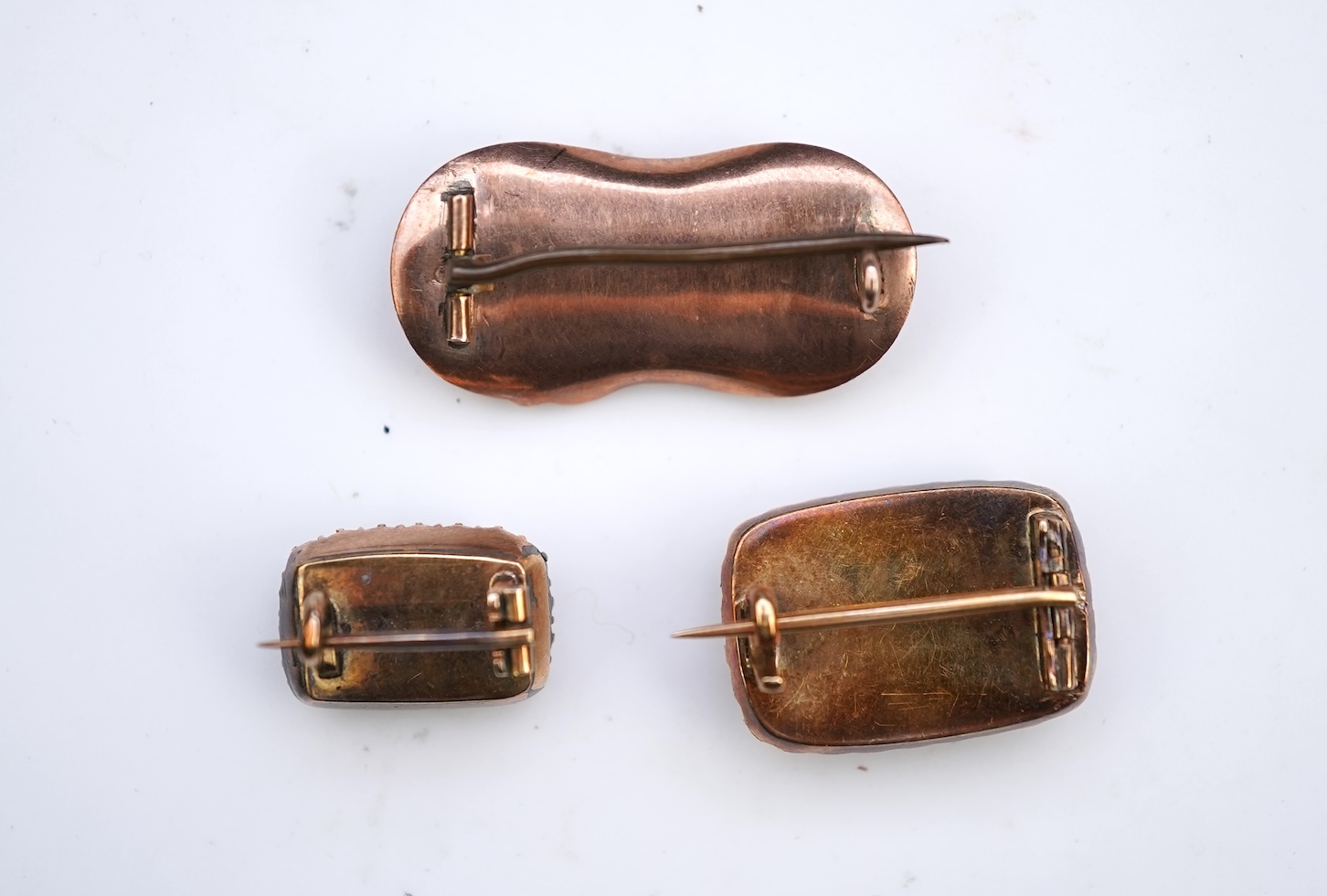All in generally good condition, minor wear commensurate with age, minor imperfections to hair work. Two pins of base metal. Pin on ouroboros brooch not fitting securely in catch. Combined gross weight approximately 8 grams.