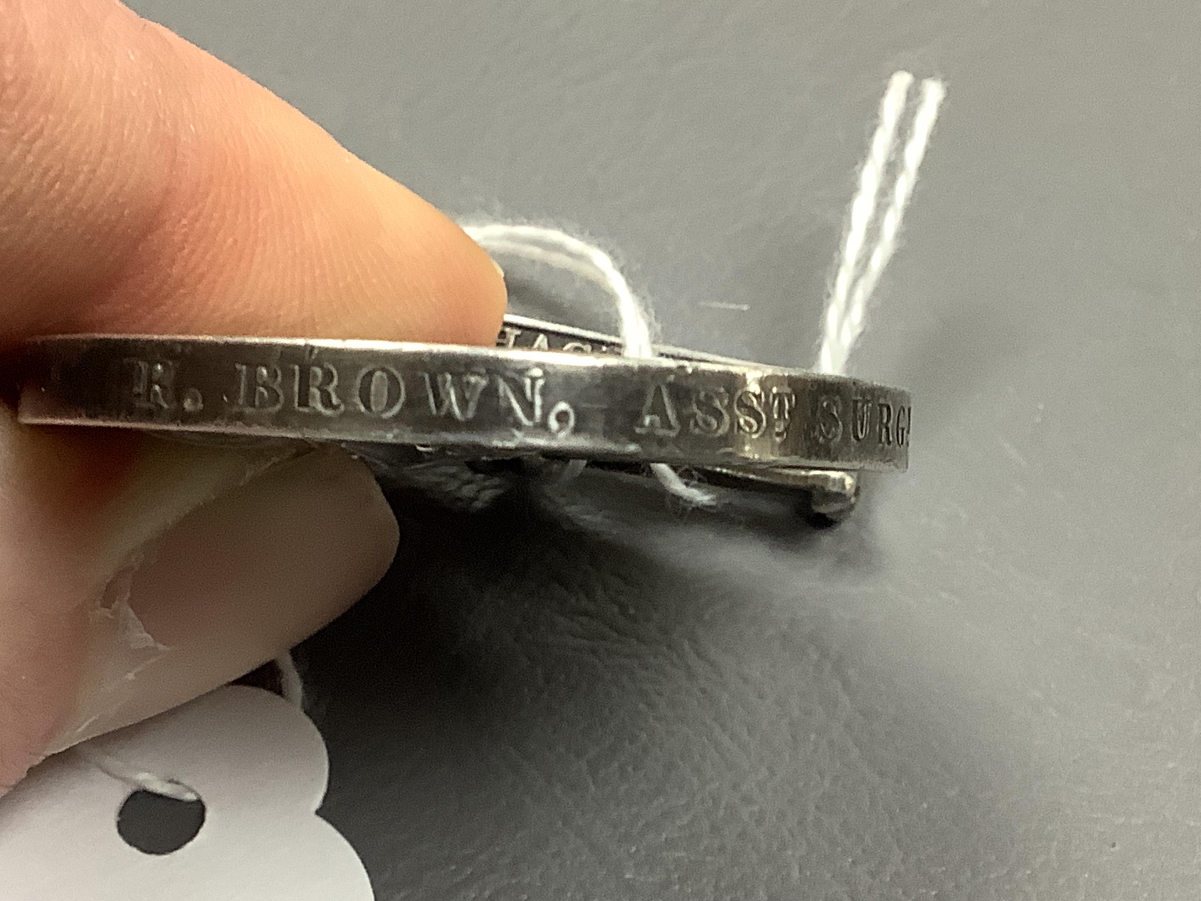 Lot 320 , A Naval General Service medal with Copenhagen 1801 clasp awarded to R. Brown Asst. Surgeon. (of the 49th Foot). Condition - fair to good, lacking ribbon