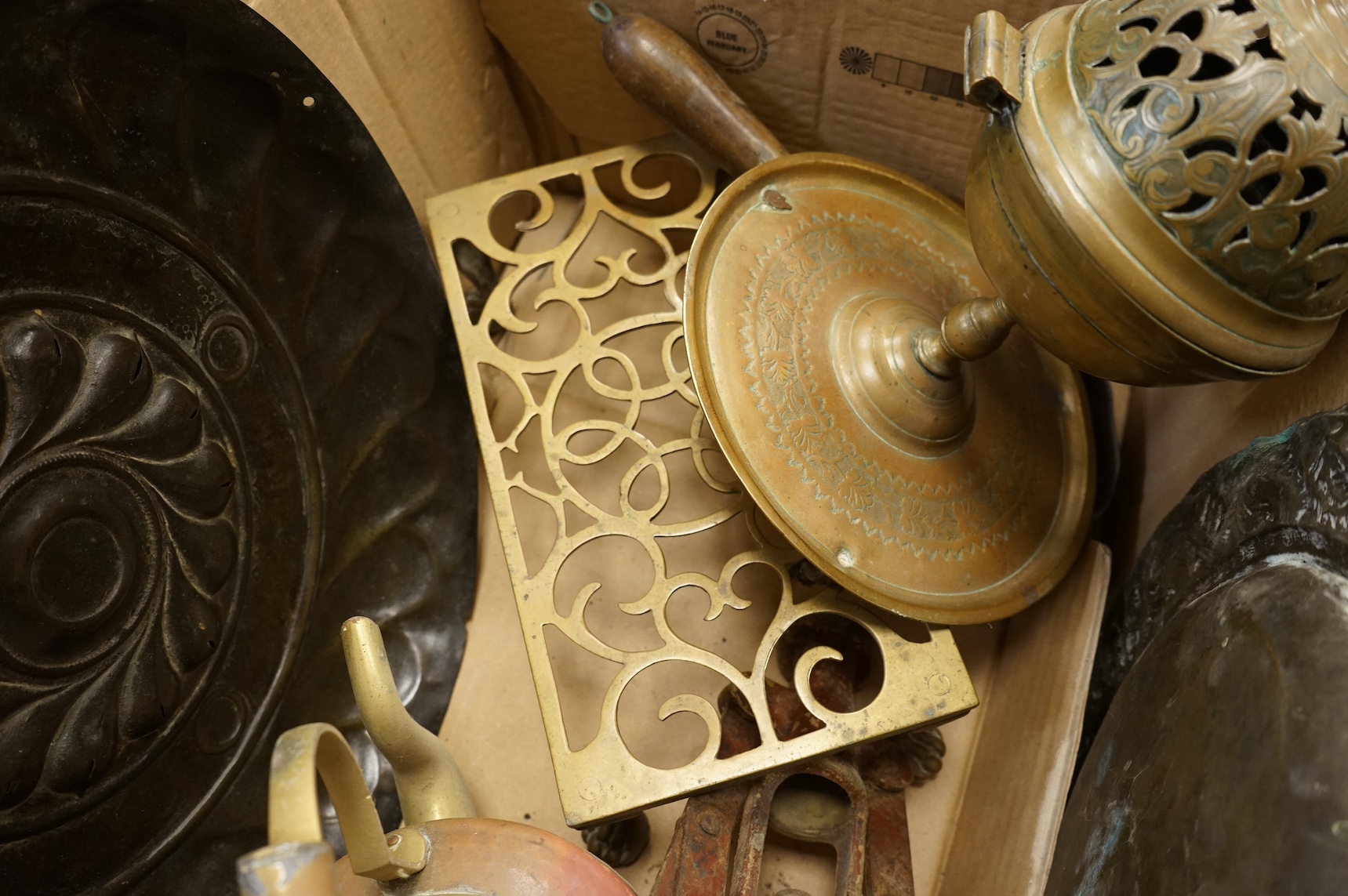 A 17th century Nuremburg embossed brass alms dish, and other metalware, dish 34cm. Condition - worn