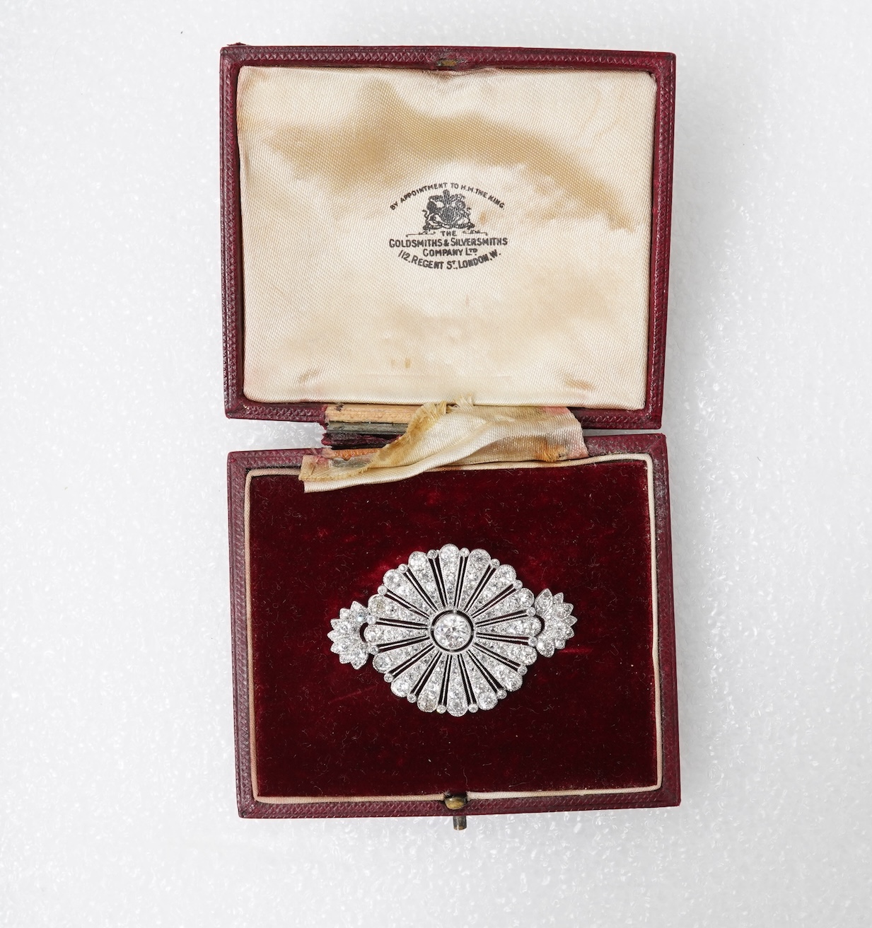 A fine Belle Epoque diamond brooch, early 20th century, centring on a circular-cut diamond weighing approximately 0.80 carats, within a floral brooch with palmettes to each end, set with circular-cut diamonds in millegrain-bordered platinum, length 4.9cm, fitted case stamped Goldsmiths & Silversmiths Company Ltd