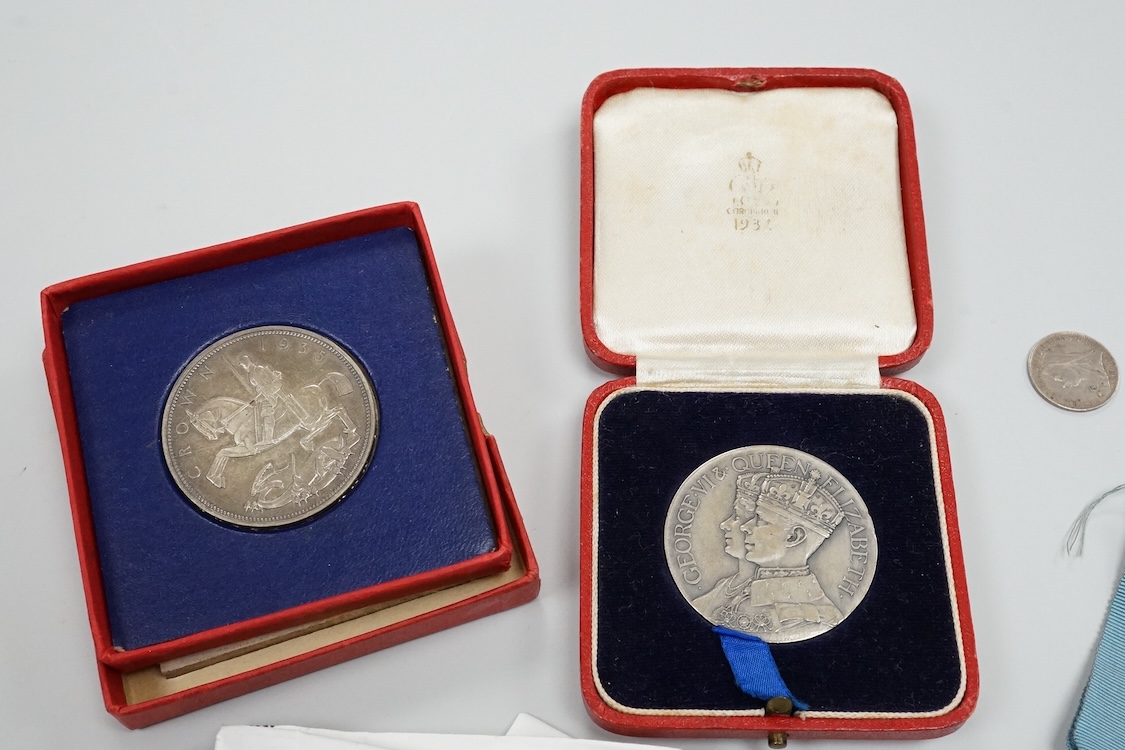 together with a cased 1937 George VI coronation medal, a First World War medal trio awarded to 9803 Pte. A.E. Tate. Devon Regiment, three WWII medals; the France and Germany Star, the 1939-1945 Star, and the 1939-1945 Medal, a George VI Territorial Army medal For Efficient Service, a Royal Artillery cap badge, four sweetheart brooches including RAF, Fleet Air Arm, London Irish Rifles, etc., two brooches stamped ‘silver’, six medallions, including one for the 1911 Coronation, and five cricket related, three hallmarked silver, together with a few coins including two 1935 crowns, two 1902 crowns, uncased Maundy money, etc.