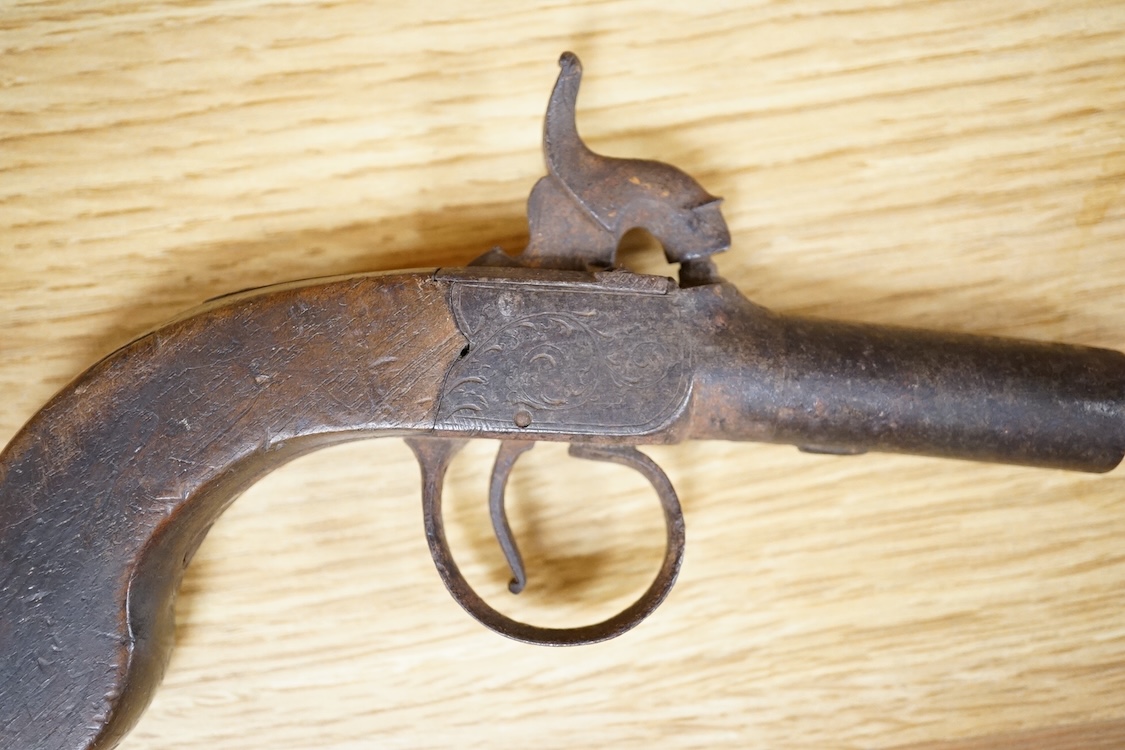 A pair of percussion cap pistols with turn off 5cm barrels, the frames engraved Noch, London, Birmingham proved, slab walnut butts (2) * Due to new safety regulations and legal restrictions with ParcelForce and Royal Mail, we are unable to pack and/or send swords, bladed items and weaponary through postal service.