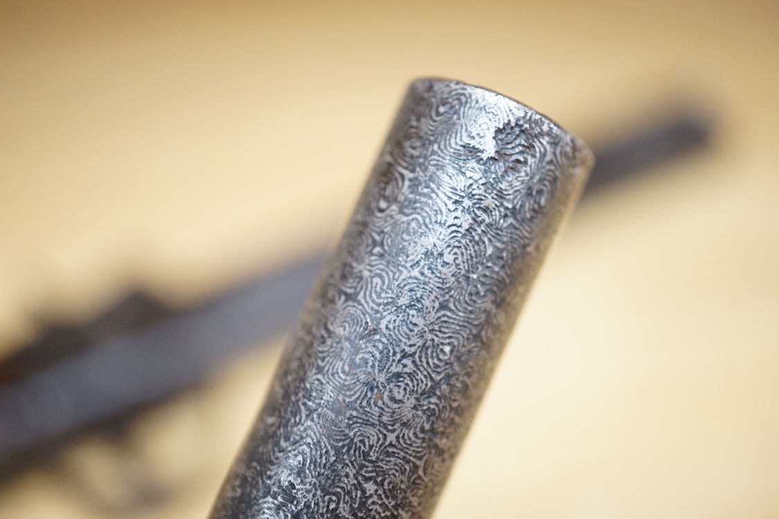 A boxlock percussion pocket pistol with Damascus twist turn off barrel, liege proofs, rounded wooden grip replaced, together with an ‘over and under’ boxlock percussion pistol * Due to new safety regulations and legal restrictions with ParcelForce and Royal Mail, we are unable to pack and/or send swords, bladed items and weaponary through postal service.