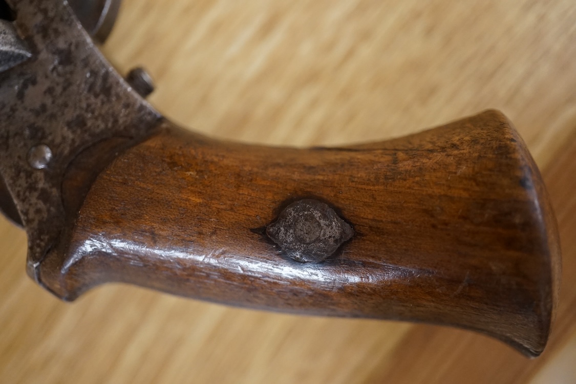 A six shot 7mm Belgian pinfire revolver and another similar, both with folding triggers and wooden grips * Due to new safety regulations and legal restrictions with ParcelForce and Royal Mail, we are unable to pack and/or send swords, bladed items and weaponary through postal service.