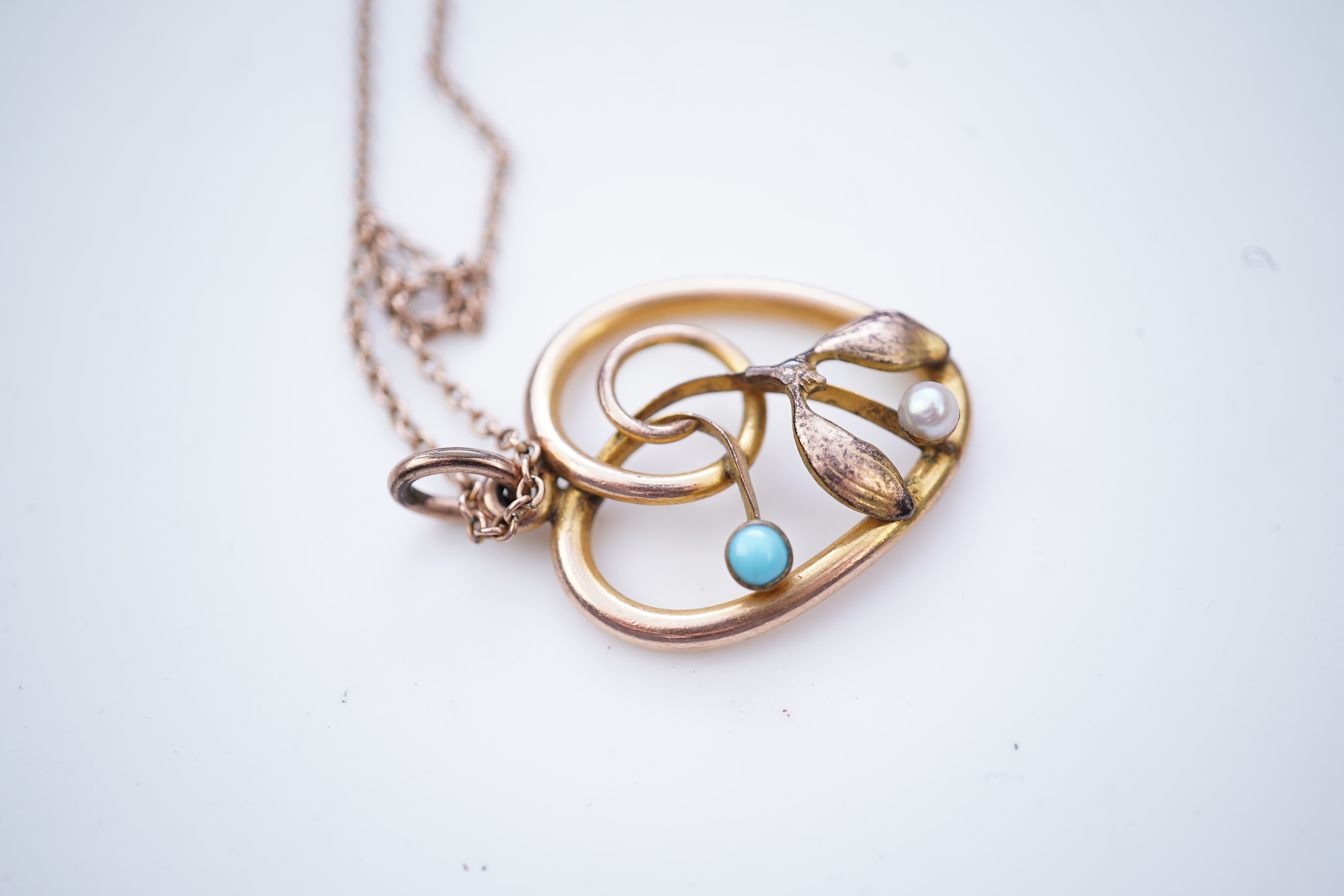 An Edwardian seed pearl and turquoise pendant, early 20th century, designed as a foliate heart-shaped scroll enclosing a sprig of mistletoe, set with a seed pearl and a turquoise cabochon, mounted in gold, to a gold chain necklace with barrel clasp, pendant length 3.2cm, chain length 48cm, chain stamped 9CT, gross weight 6 grams, pearl untested