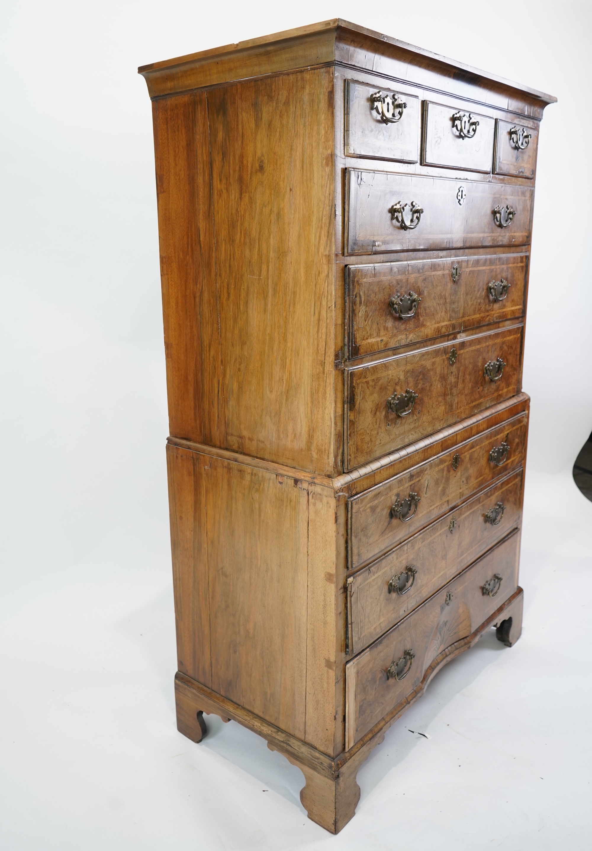 A George I feather banded, concave inlaid starburst walnut chest on chest fitted three short and six graduated long drawers on bracket feet. 100cm wide, 54cm deep, 166cm high