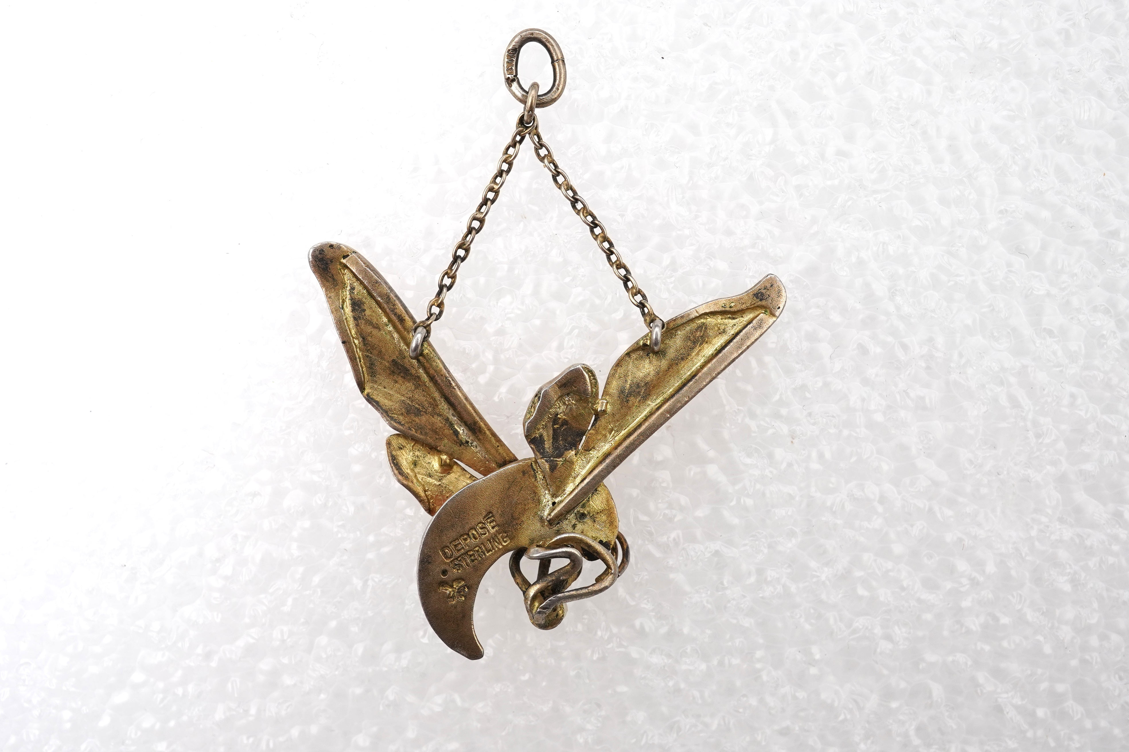 An unusual Art Nouveau silver gilt and enamel pendant, circa 1900, modelled as a hawk moth in flight, its legs grasping a pearl, its eyes set with green paste cabochons, its wings tipped with split pearls, its wings and body modelled in silver, applied with translucent orange, white and green enamel, suspended from two chains, total length 5.7cm, stamped DEPOSÉ STERLING, unidentified insect maker's mark, bail with indistinct marks