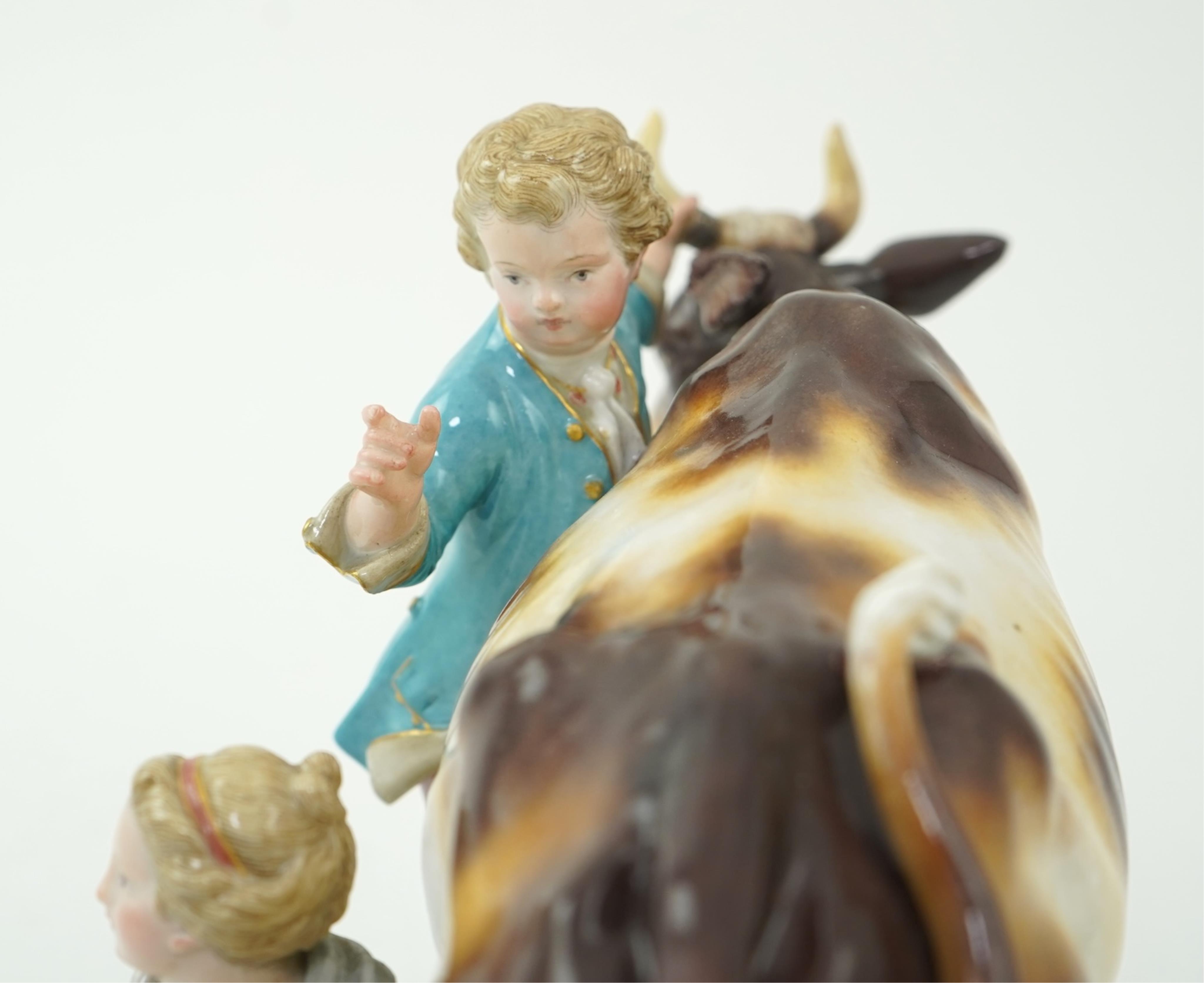 A Meissen group of a boy and girl milking a cow, 19th century, on a rococo scrollwork base, underglaze blue crossed swords mark and incised model number R79, 22.5cm long