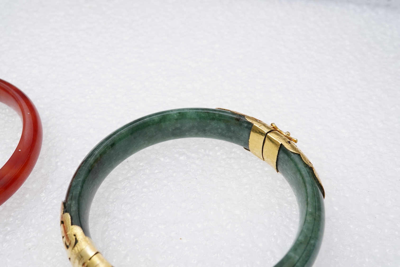 Two jade bangles, one in spinach-coloured nephrite, the other in reddish orange jadeite, inner circumferences 20cm and 18cm respectively, in unmarked mounts