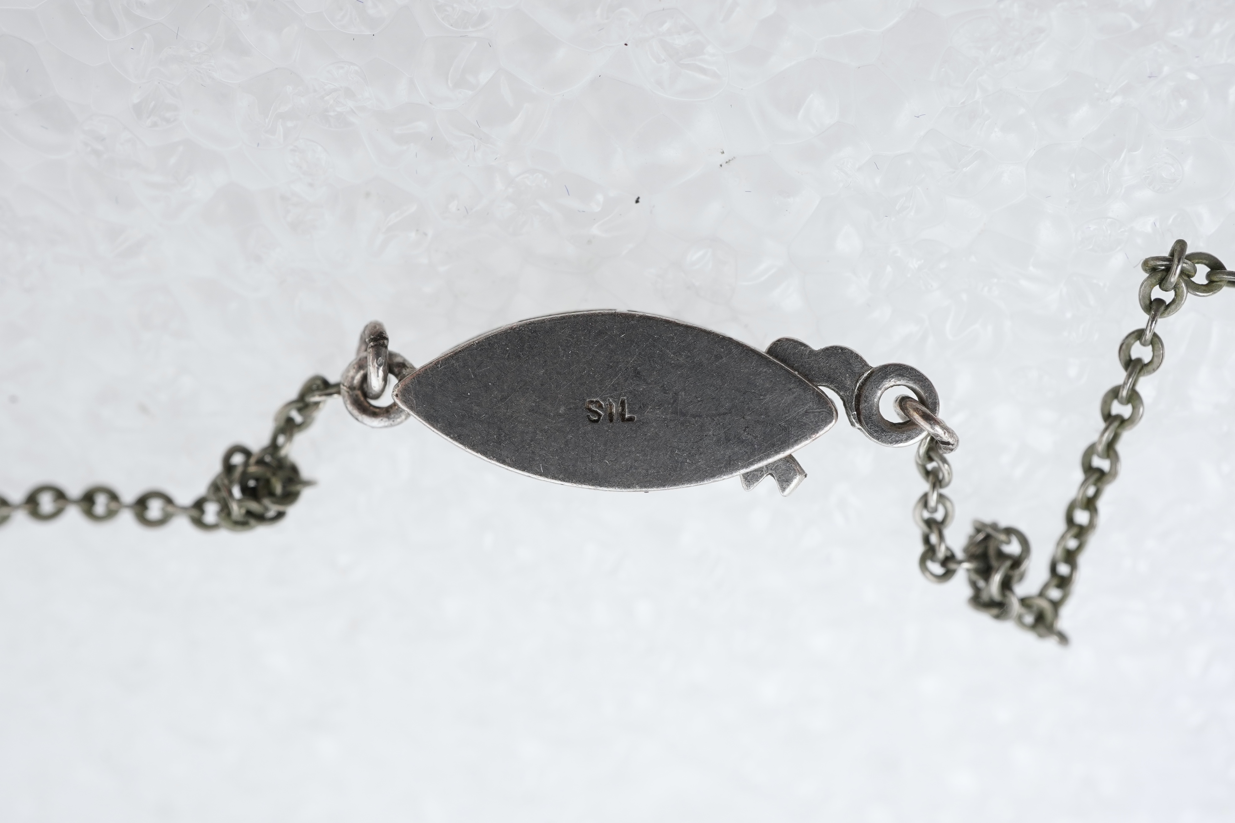 A pearl and diamond pendant, circa 1900, of drop-shaped outline, centring on a pearl measuring approximately 9 x 7.5mm, within a border of cushion-shaped diamonds totalling approximately 0.60 carats, suspended from rose-cut diamond links spaced by sections of knife wire, to a chain necklace, mounted in silver and gold, pendant length 3.5cm, chain length 42cm, clasp set with pastes, pearl untested