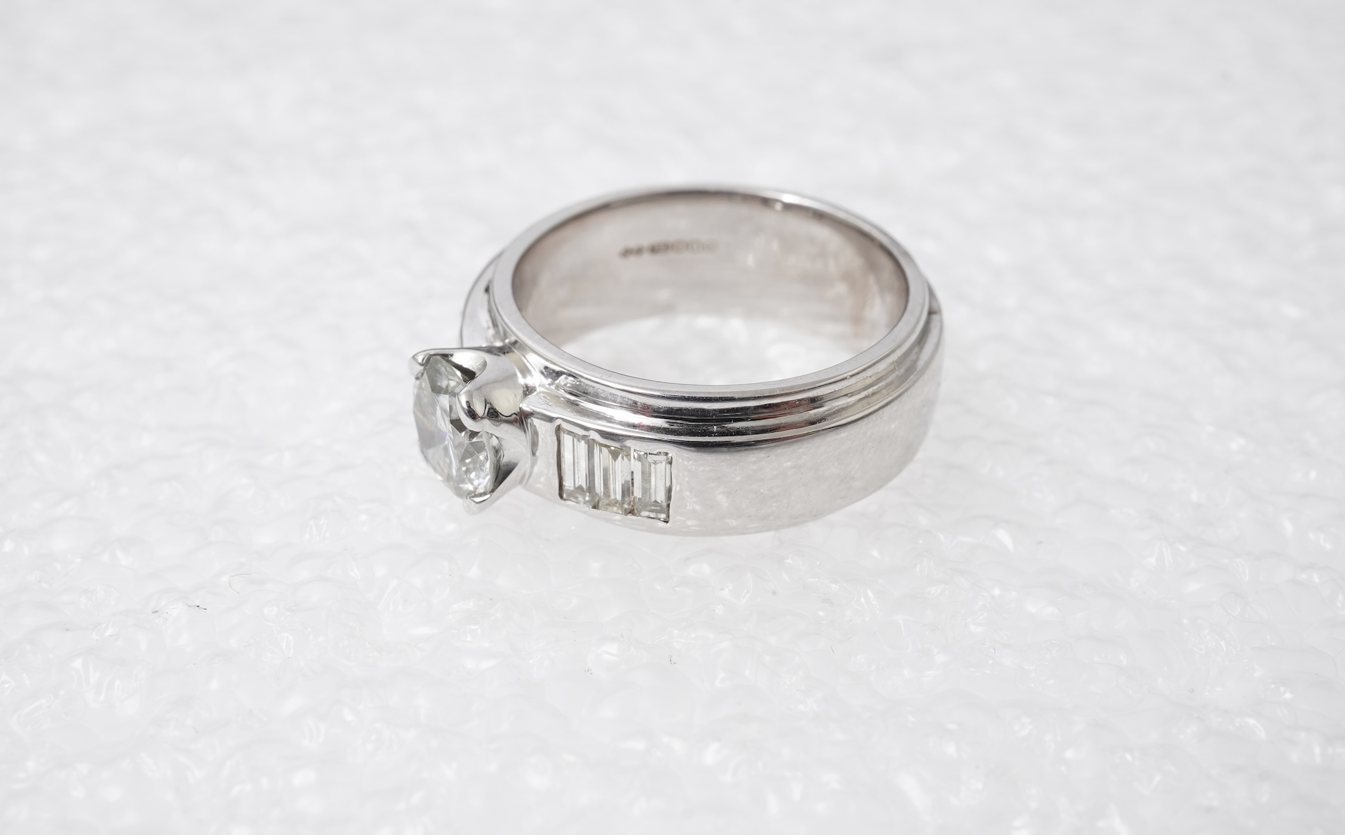 A diamond ring, claw-set with a circular-cut diamond weighing 1.11 carats, to a mount channel-set to the shoulders with baguette diamonds totalling approximately 0.30 carats, mounted in 18ct white gold, size O1/2, British hallmarks, gross weight approximately 13 grams