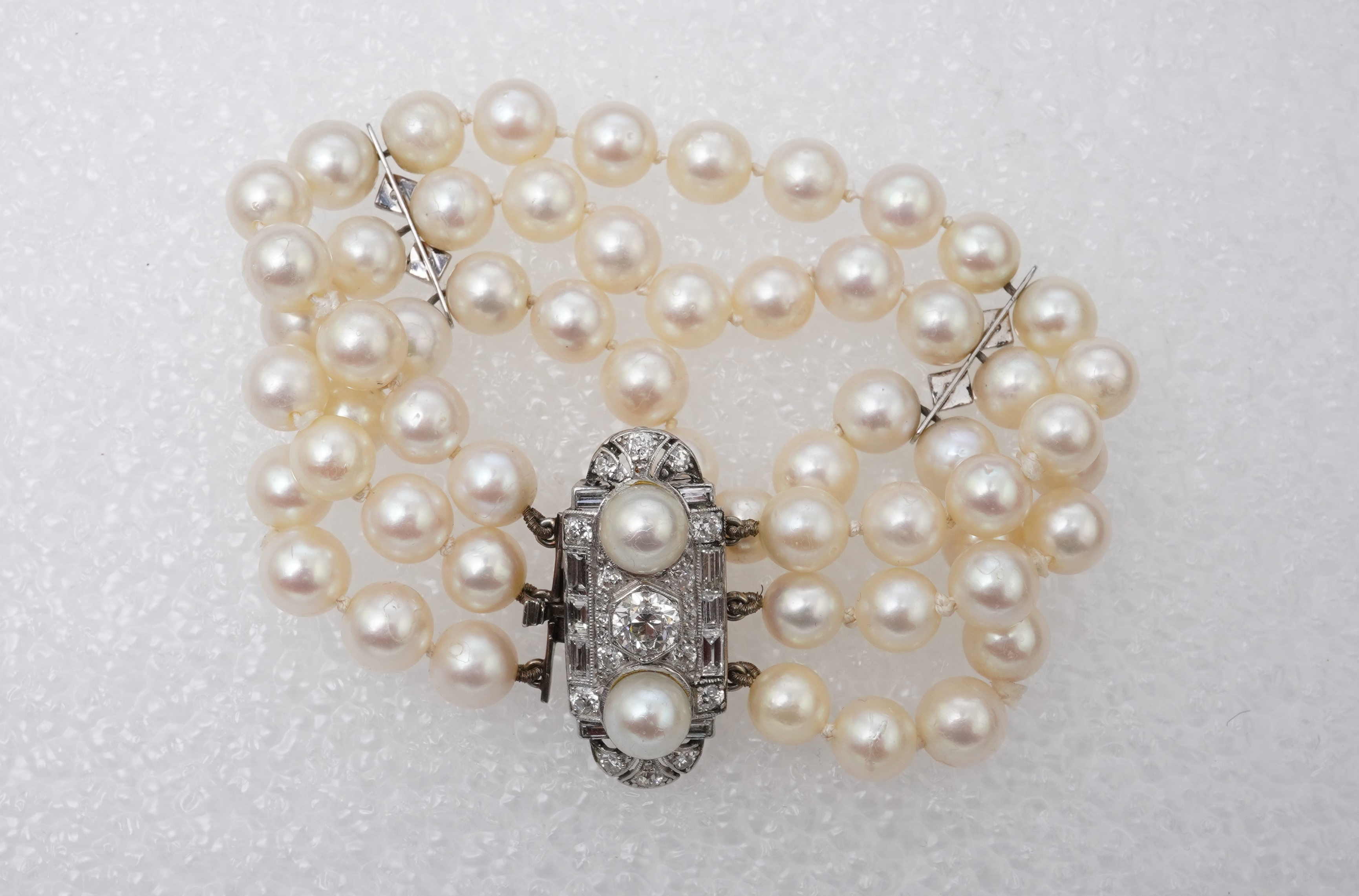 An Art Deco cultured pearl, pearl and diamond bracelet, 1930s and later, the clasp of oval outline, of geometric design, set with circular-cut and baguette diamonds totalling approximately 1.70 carats, and two pearls measuring approximately 7mm diameter each, to a later three-strand bracelet of cultured pearls spaced by bar links set with brilliant-cut diamonds, length 17cm, pearls in clasp untested