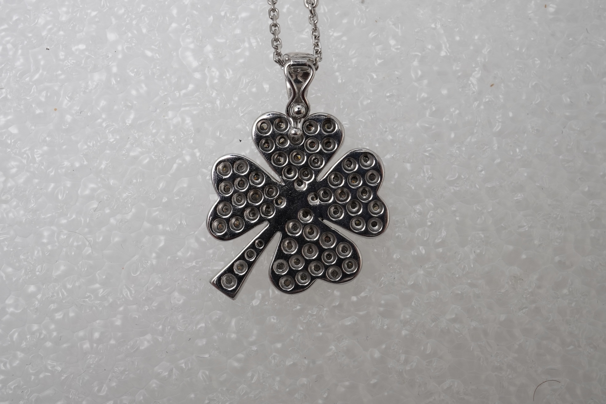 A diamond and tsavorite pendant necklace, the pendant modelled as a four-leaf clover, pavé-set with brilliant-cut diamonds totalling approximately 1.70 carats, to a chain spectacle-set with brilliant-cut diamonds totalling approximately 0.20 carats, and circular-cut tsavorite garnets, pendant length 3cm, chain length 44cm, chain stamped 750, gross weight 14 grams