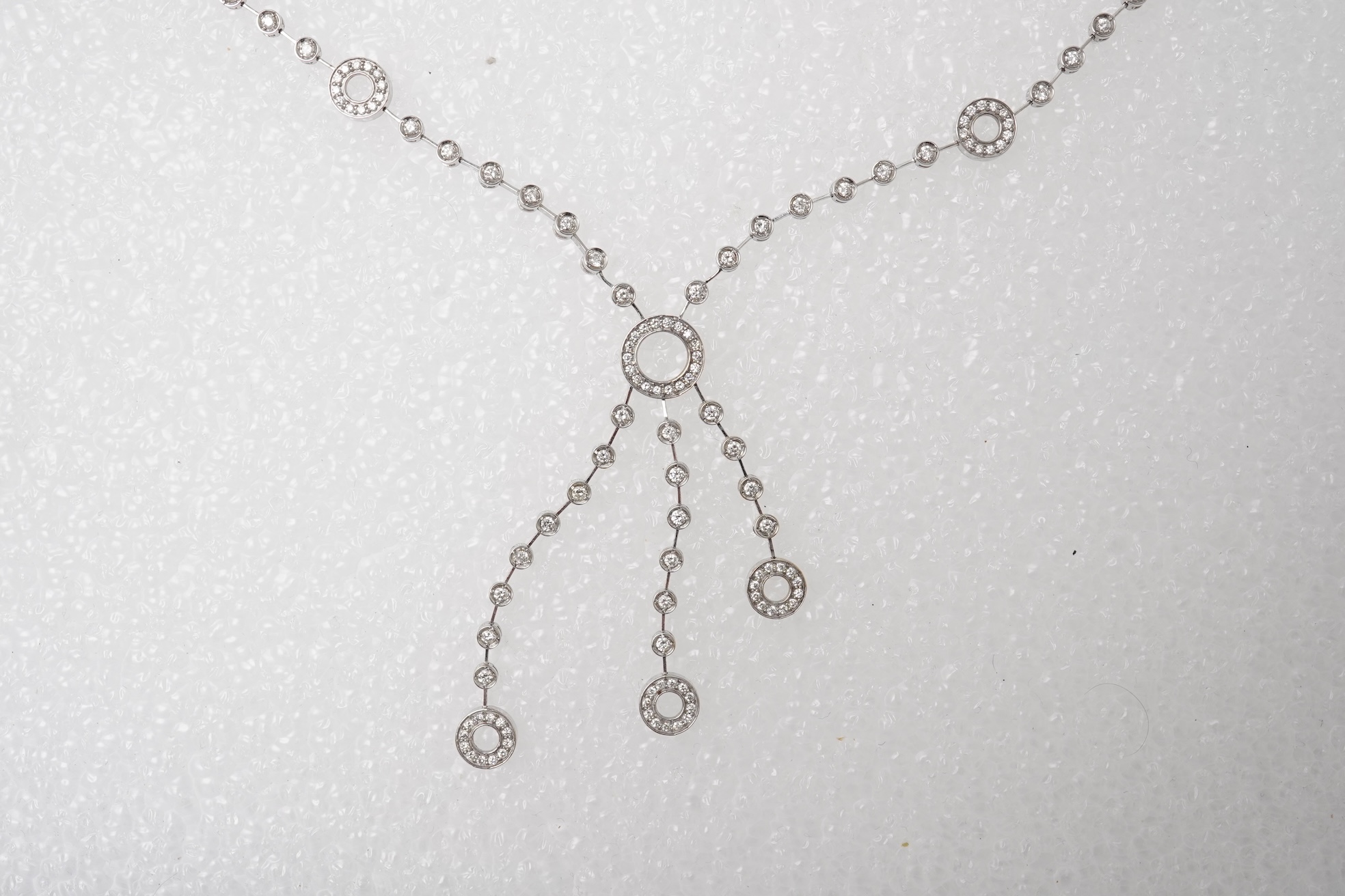 A diamond necklace, composed of knife wire linking, the front with ring-shaped motifs, the central ring-shaped motif suspending three pendants, set with brilliant-cut diamonds totalling approximately 4.50 carats, mounted in white gold, necklace approximately 48cm, pendant length 6.9cm, stamped 18K, gross weight approximately 22 grams