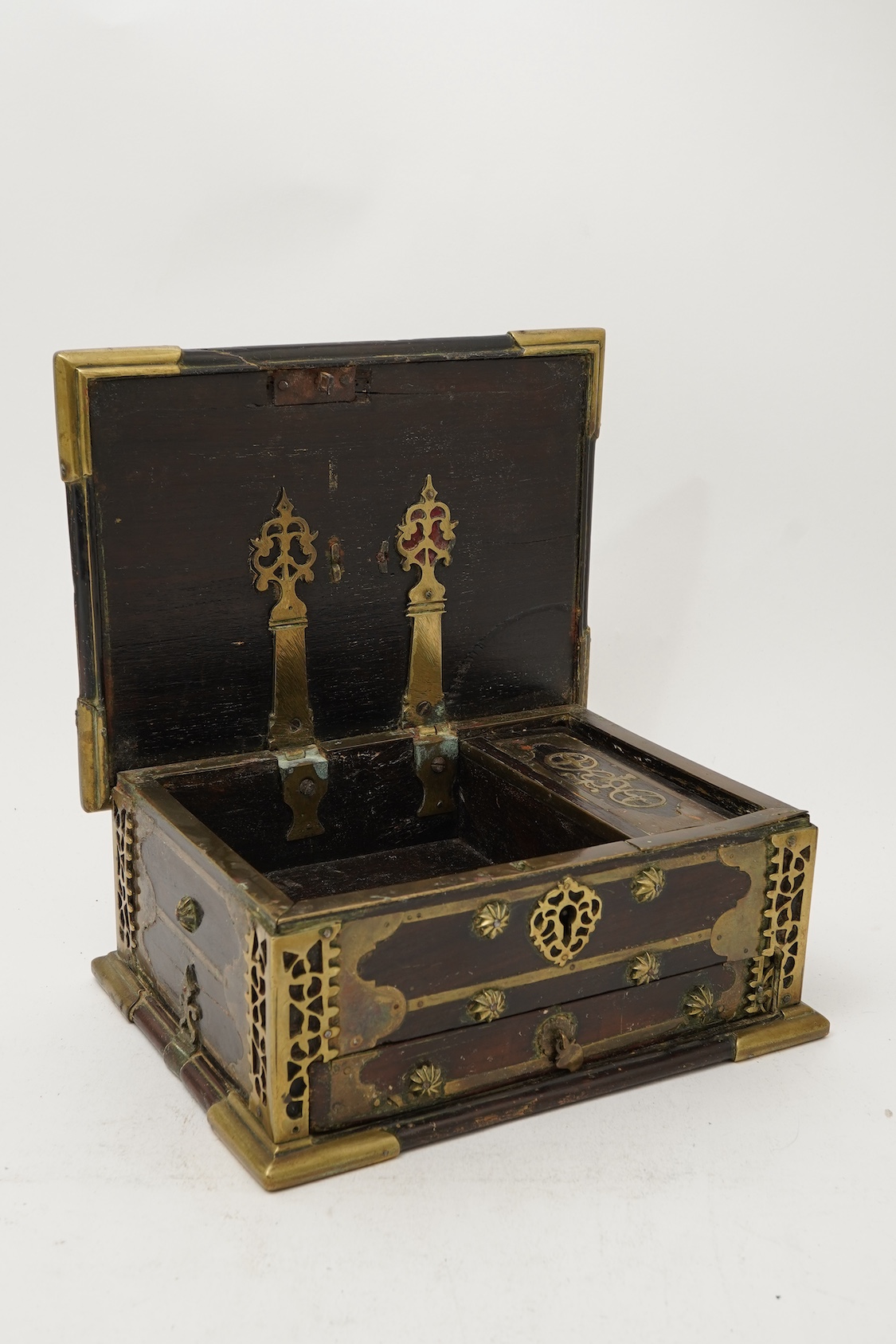 A Batavia or Ceylonese rosewood and brass mounted Betel nut box, 18th century, decorated with brass scrollwork panels, star shaped bosses, enclosing a single lidded compartment and with a single base drawer, 26cm x 19.5cm