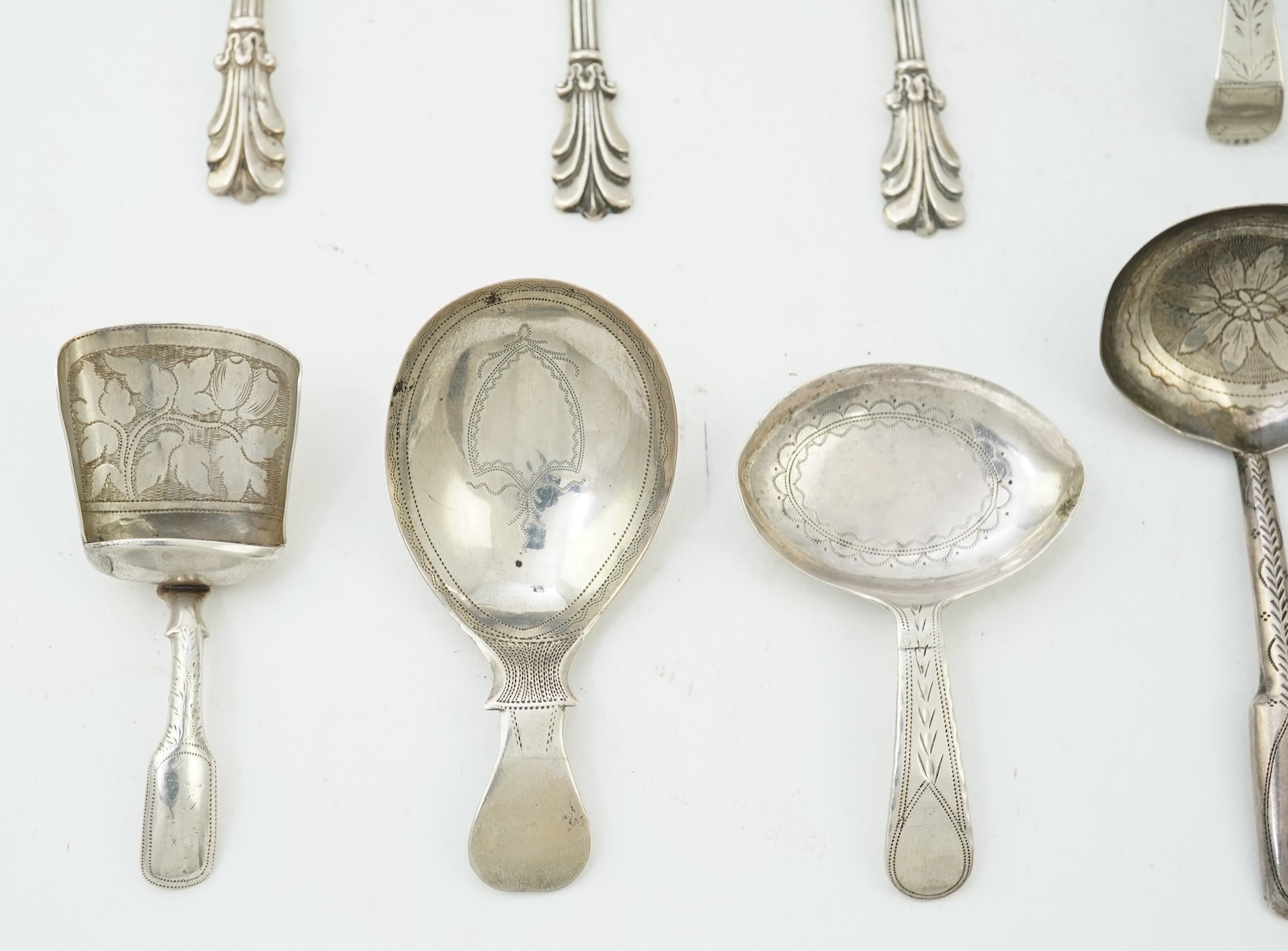 Ten assorted 19th century silver caddy spoons, to include Joseph Taylor, Birmingham, 1821, with ovoid bowl and engraved handle and bowl, (a.f.), William Pugh, Birmingham, 1811, with fiddle handle and engraved foliate bowl, George Unite, Birmingham, 1846, with feather handle and bowl, unmarked with oval bowl, Joseph Wilmore, Birmingham, 1805, George Unite, Birmingham, 1839 with feather handle, George Unite, Birmingham, 1841, with feather handle, Lias Brothers, London, 1829, Joseph Taylor, Birmingham, 1820 with shovel bowl engraved with tea leaves, Joseph Taylor, Birmingham, 1803 with oval bowl engraved with shield cartouche, 10.6cm et infra.