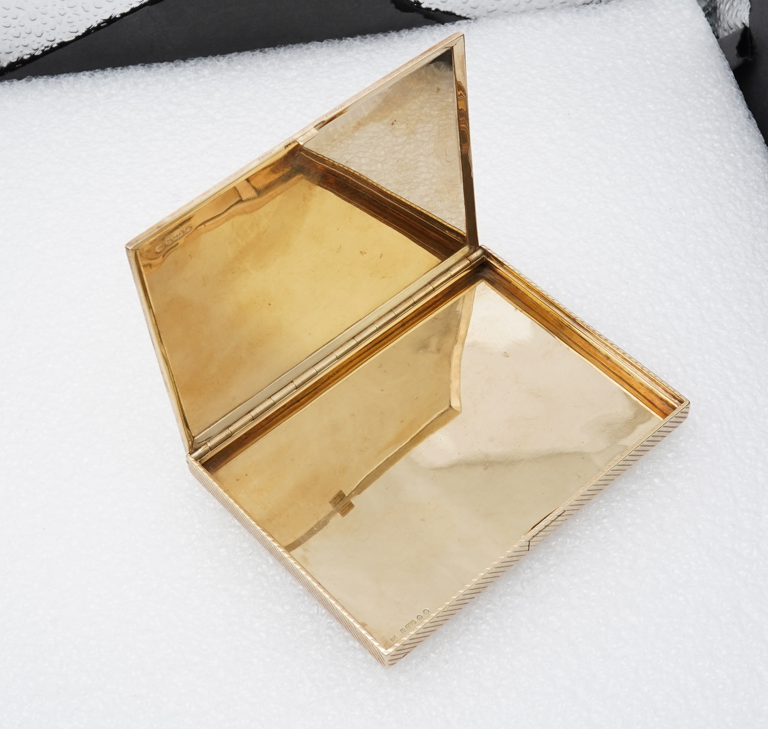 Cartier, a 9ct gold cigarette case, London, circa 1933, of rectangular outline with fluted engraving, opening via a concealed push piece to reveal a plain interior, measuring 10.8 x 7.9 x 0.9cm, signed Cartier London, numbered 2023, British hallmarks for 9ct gold, sponsor's mark JC for Cartier London, date letter for 1933, gross weight approximately 158 grams