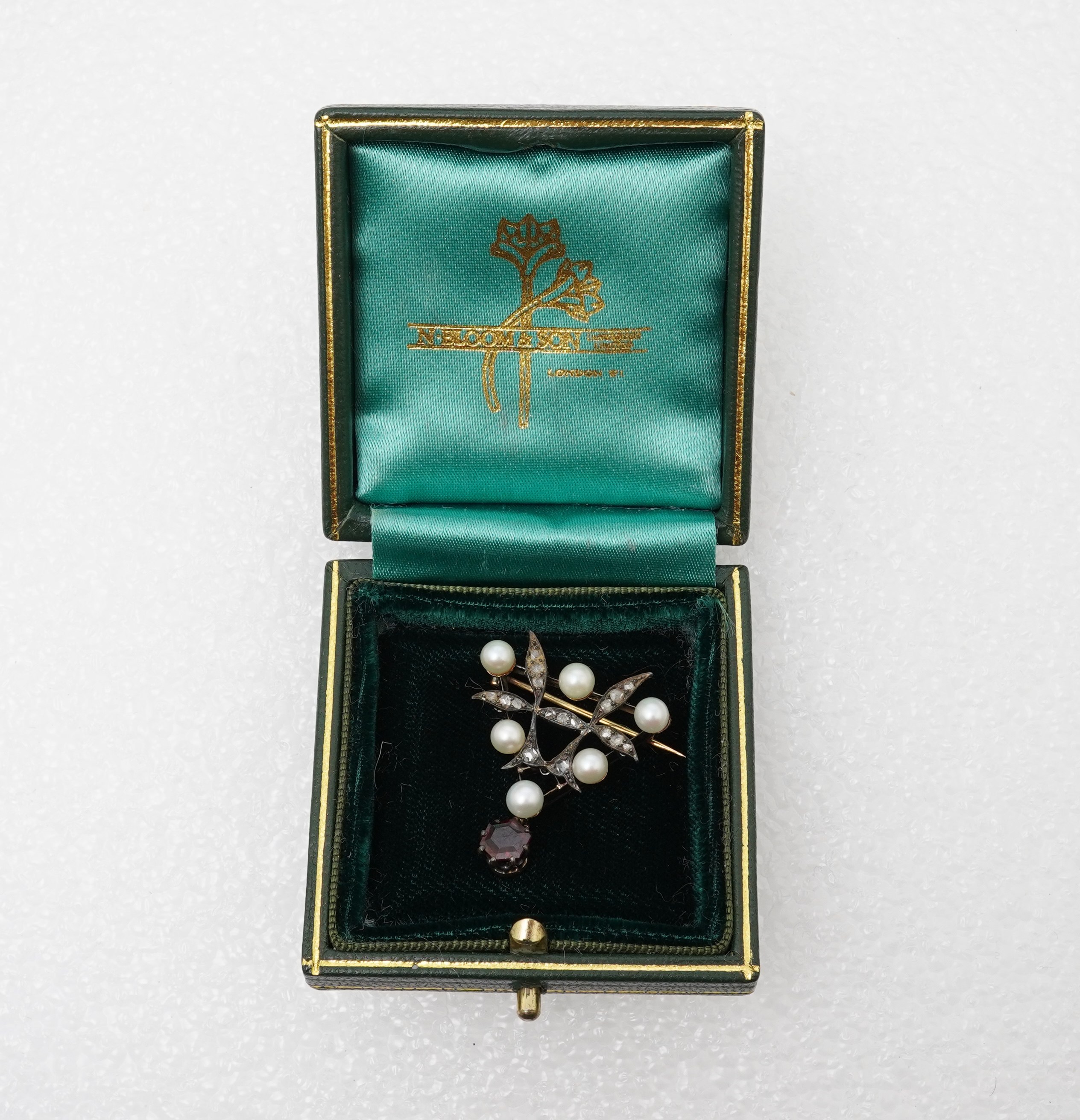 Lot 414 , A pearl, garnet and diamond brooch