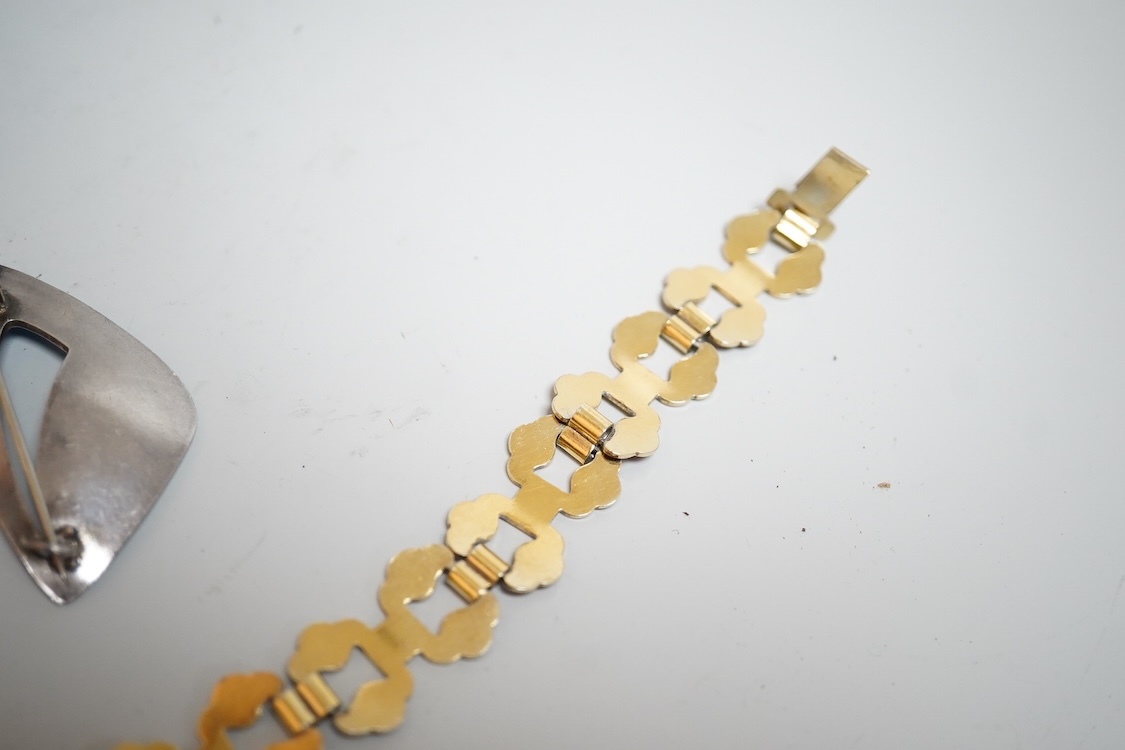 A pair of Norwegian gilt sterling and blue enamel ear clips by David Andersen, 31mm, together with one other Norwegian 925S and blue enamel free form brooch, 47mm and a gilt 925S and red enamel set necklace, 39.5cm.