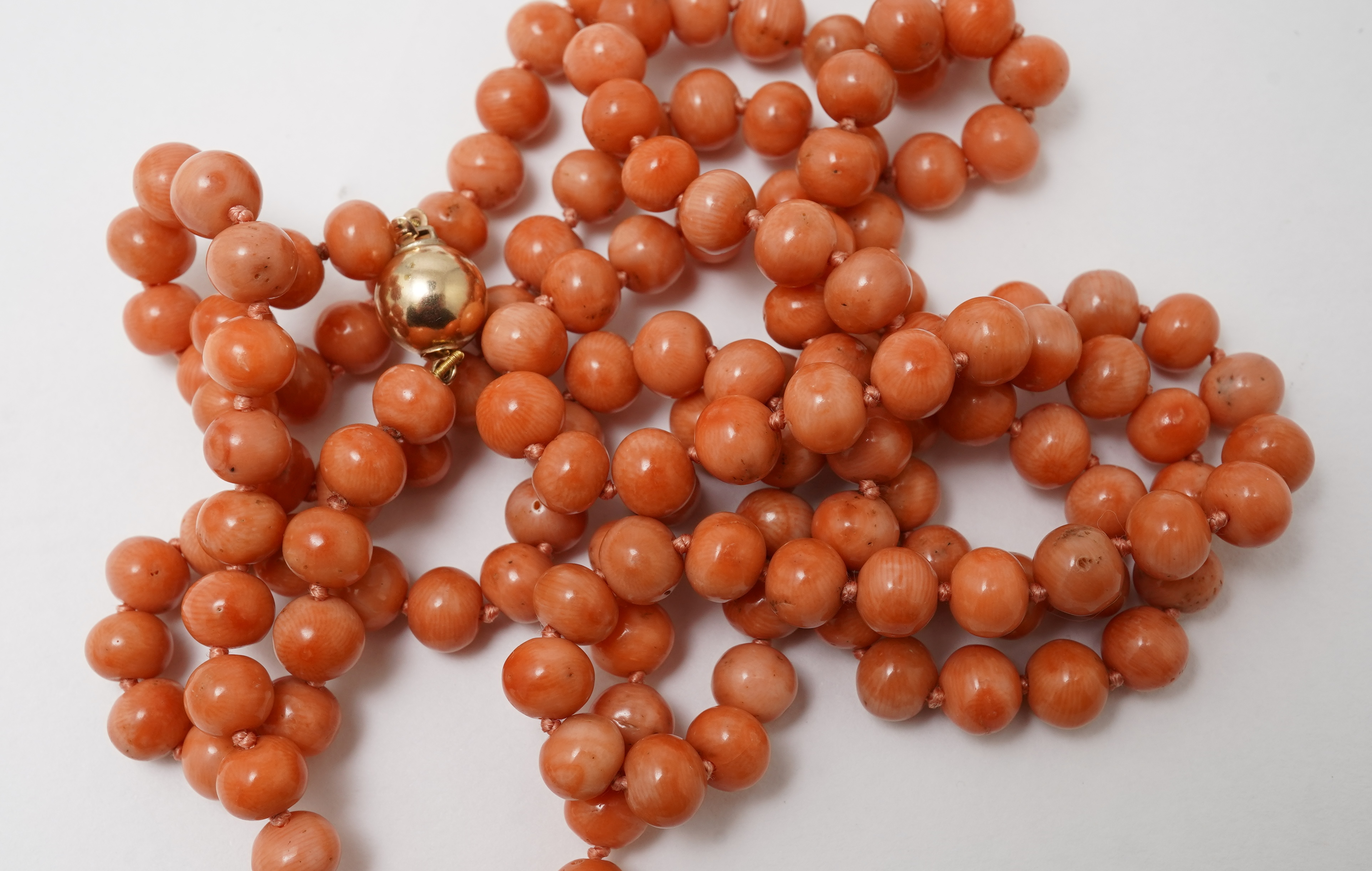A collection of coral and turquoise jewels, comprising: a coral bead necklace, beads approximately 6-7mm, to a gold spherical clasp, necklace length 102cm, clasp stamped 375, gross weight approximately 61 grams; a pair of earrings of knotted design, set with coral cabochons, length 3.4cm each, hook fittings; and a pair of quatrefoil turquoise and rose-cut diamond earrings, length 1.3cm each, screw fittings, together with a pair of detached pear-shaped cabochon turquoise drops