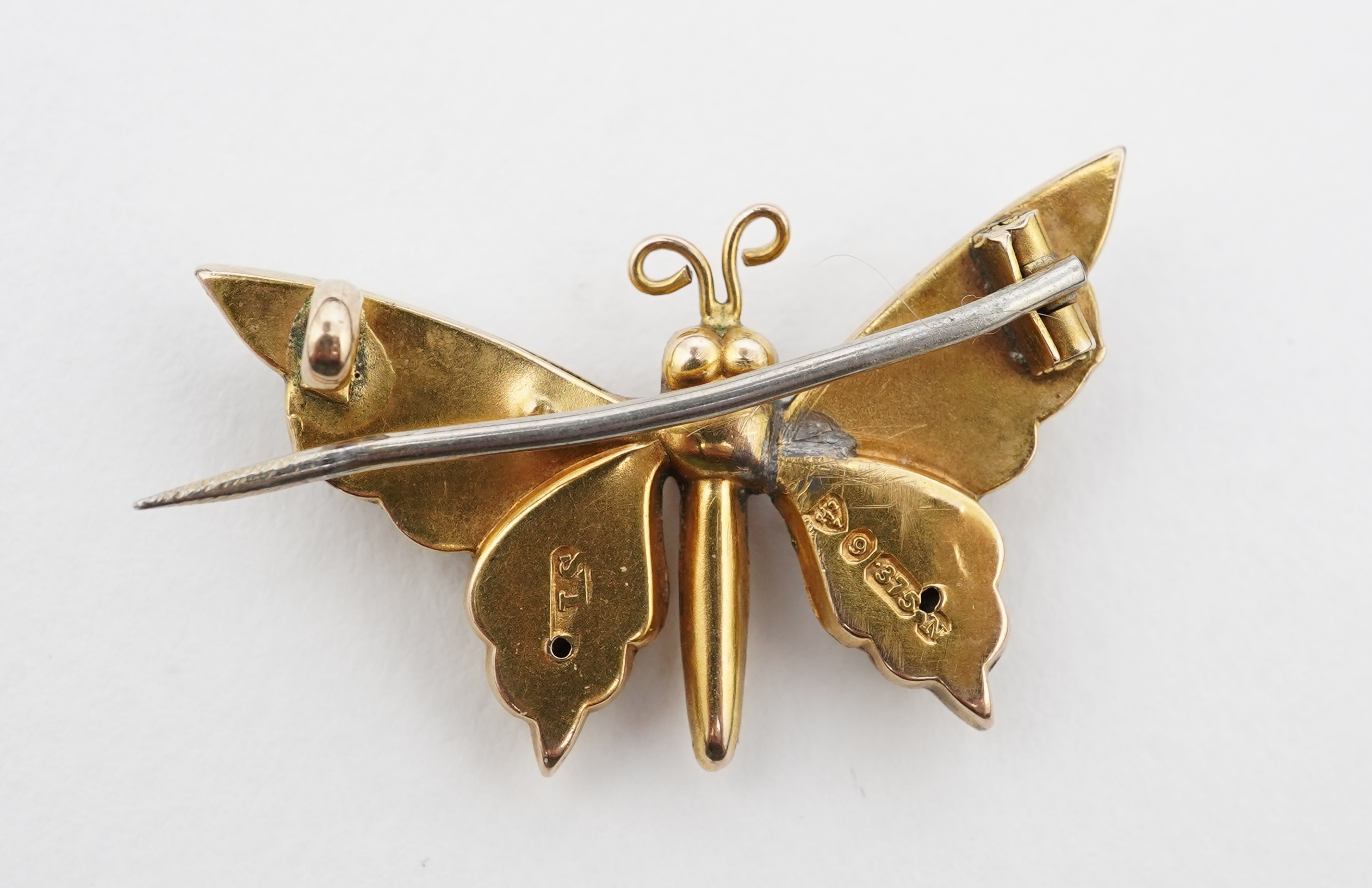One wing repaired, some minor solder visible, wings and antennae slightly lopsided, but doesn't spoil the charming design. Brooch pin in base metal.