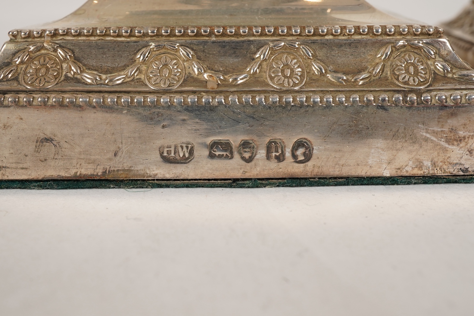 The weighted base has sprung slightly on one stick and there are a few knocks to the silver around the base rim. There are also two small dents to the neck. There are similar issues regarding small dings to the other stick, but less prominent. Hallmarks clear but with some slight rubbing to one maker's mark.