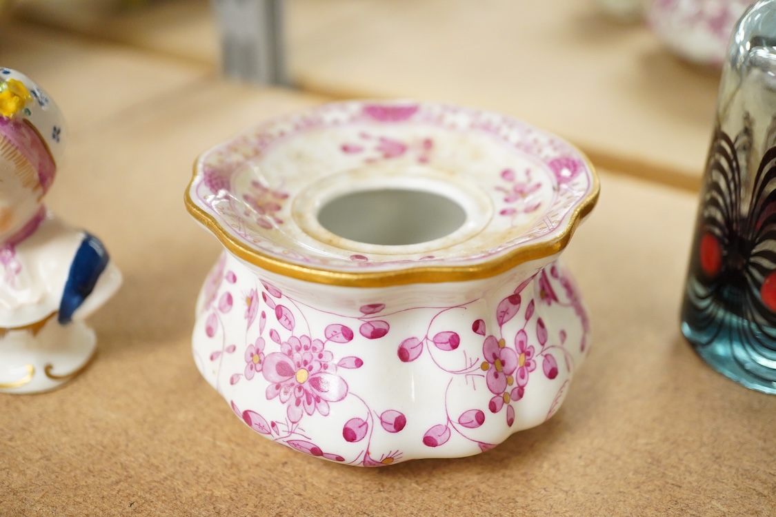 Two Paris porcelain miniatures of the Descent from the Cross, a Meissen inkwell, Staffordshire miniature busts etc, largest 13.5cm high