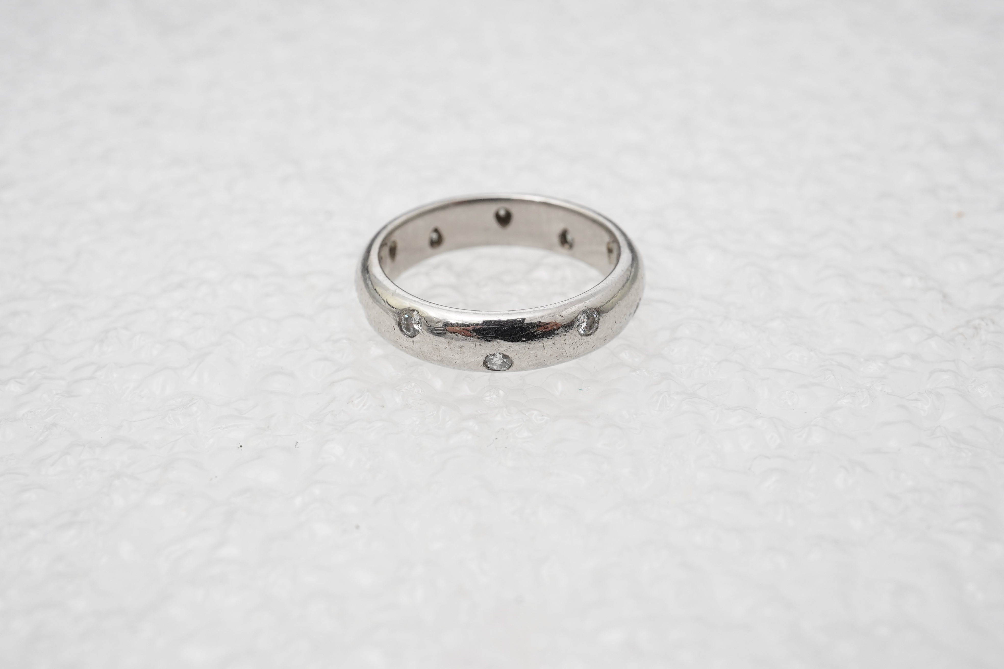 Tiffany & Co., a platinum and diamond ring, the polished platinum band rub over-set with brilliant-cut diamonds totalling approximately 0.30 carats, size J1/2, signed Tiffany & Co., British import hallmarks, sponsor's mark T&Co., gross weight approximately 7 grams, case stamped Tiffany & Co.