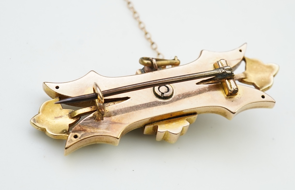 An Edwardian seed pearl brooch, early 20th century, designed as a plaque with foliate motifs at each end, set with split pearls, mounted in gold, length 4.7cm, gross weight approximately 9 grams, pearls untested