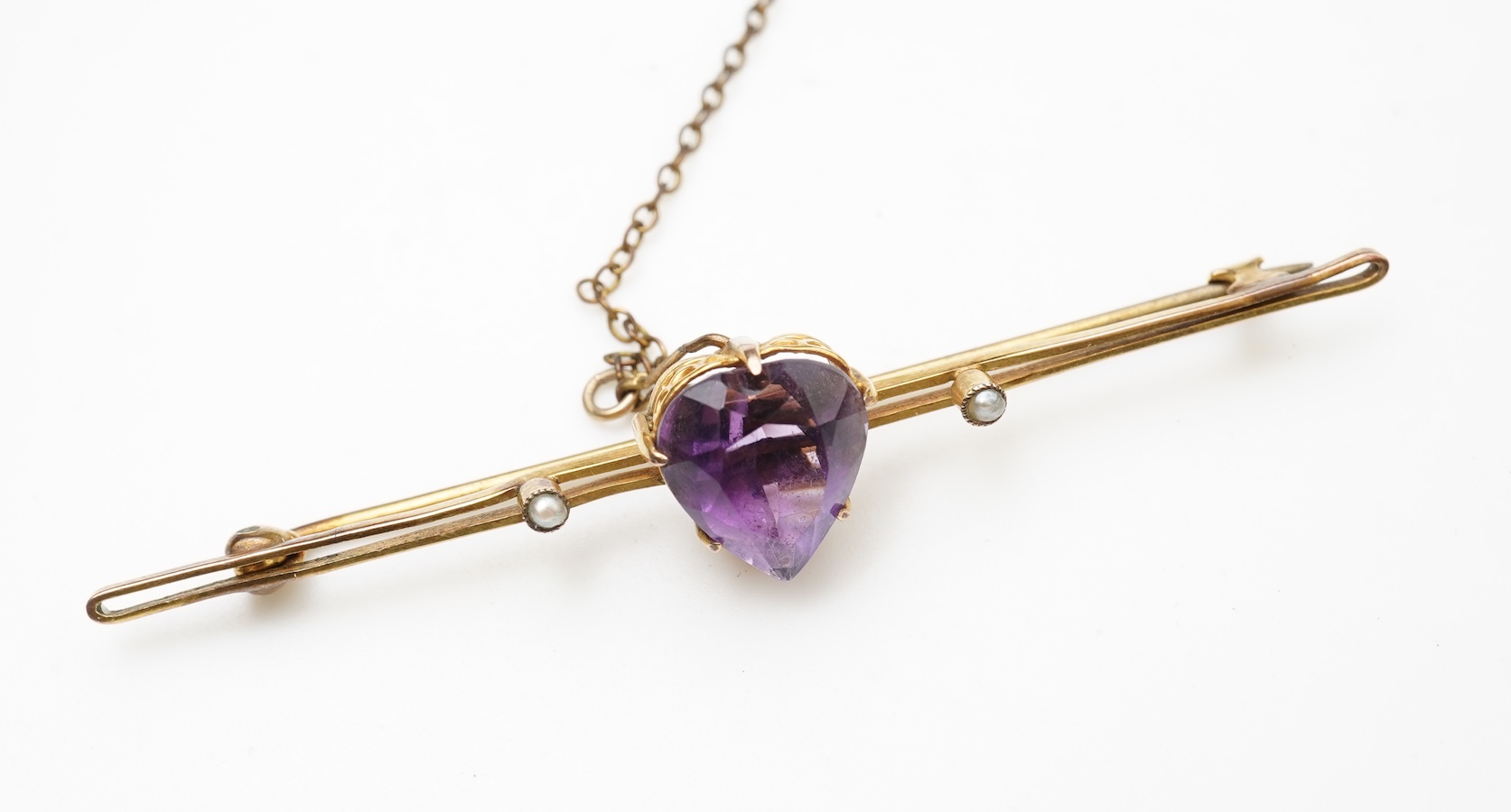 A collection of jewels, early 20th century, comprising: a peridot and seed pearl bar brooch of foliate design, mounted in gold, length 4.1cm, stamped 15CT, fitted case stamped Hunt & Roskell; a heart-shaped amethyst and seed pearl bar brooch, mounted in gold, length 6.2cm, stamped 9C; a bar brooch designed as swallows in flight, set with turquoise cabochons, mounted in gold, length 3.8cm; a 19th century pearl and emerald cluster ring with foliate openwork shoulders, mounted in gold, size K1/2; and an aquamarine and seed pearl pendant in gold, length 3.6cm, combined gross weight approximately 13 grams