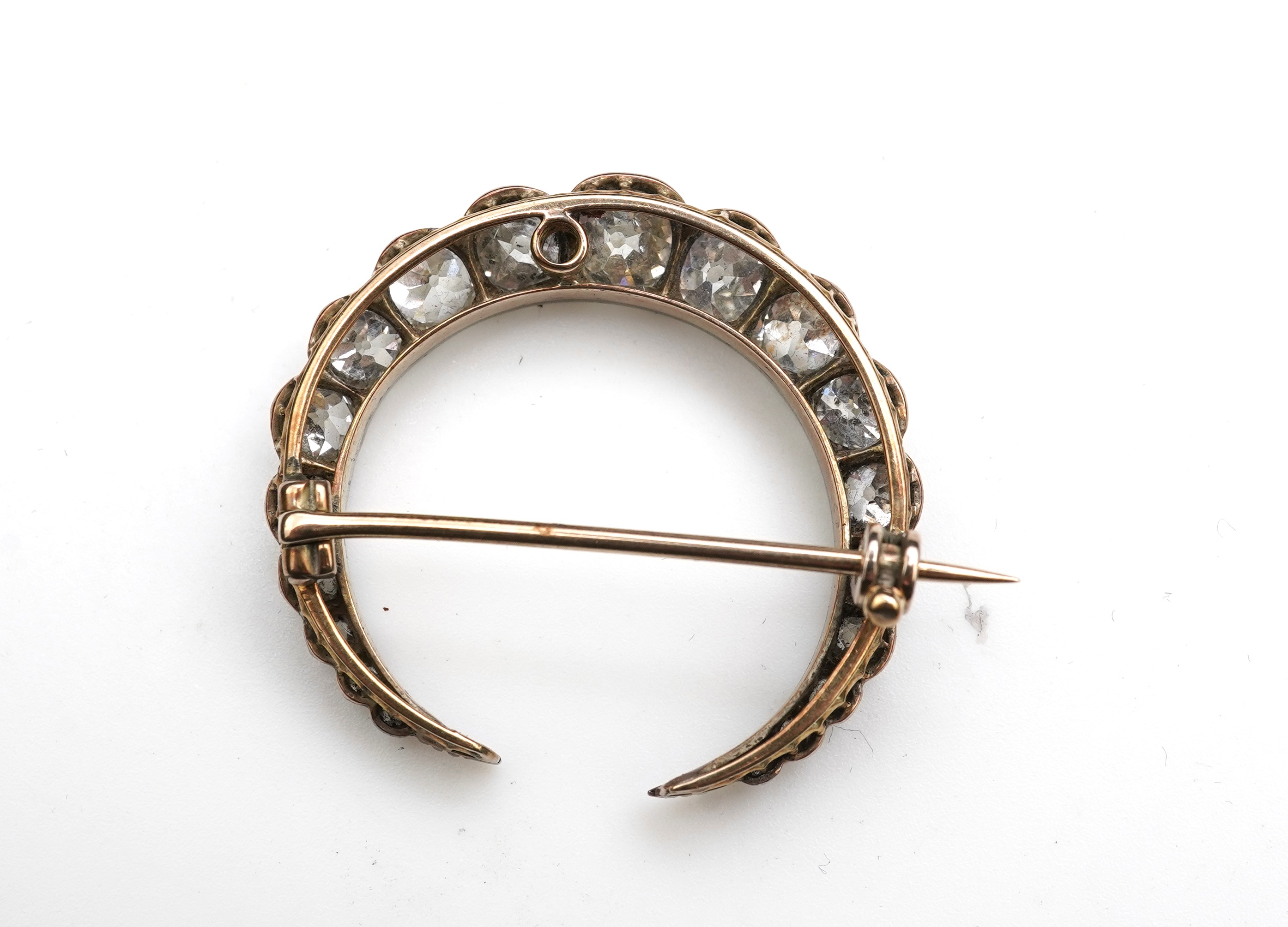 A Victorian diamond brooch, late 19th century designed as a crescent moon, set with cushion-shaped diamonds totalling approximately 2.50 carats, mounted in silver and gold, length approximately 3cm, fitted case stamped Carrington & Co