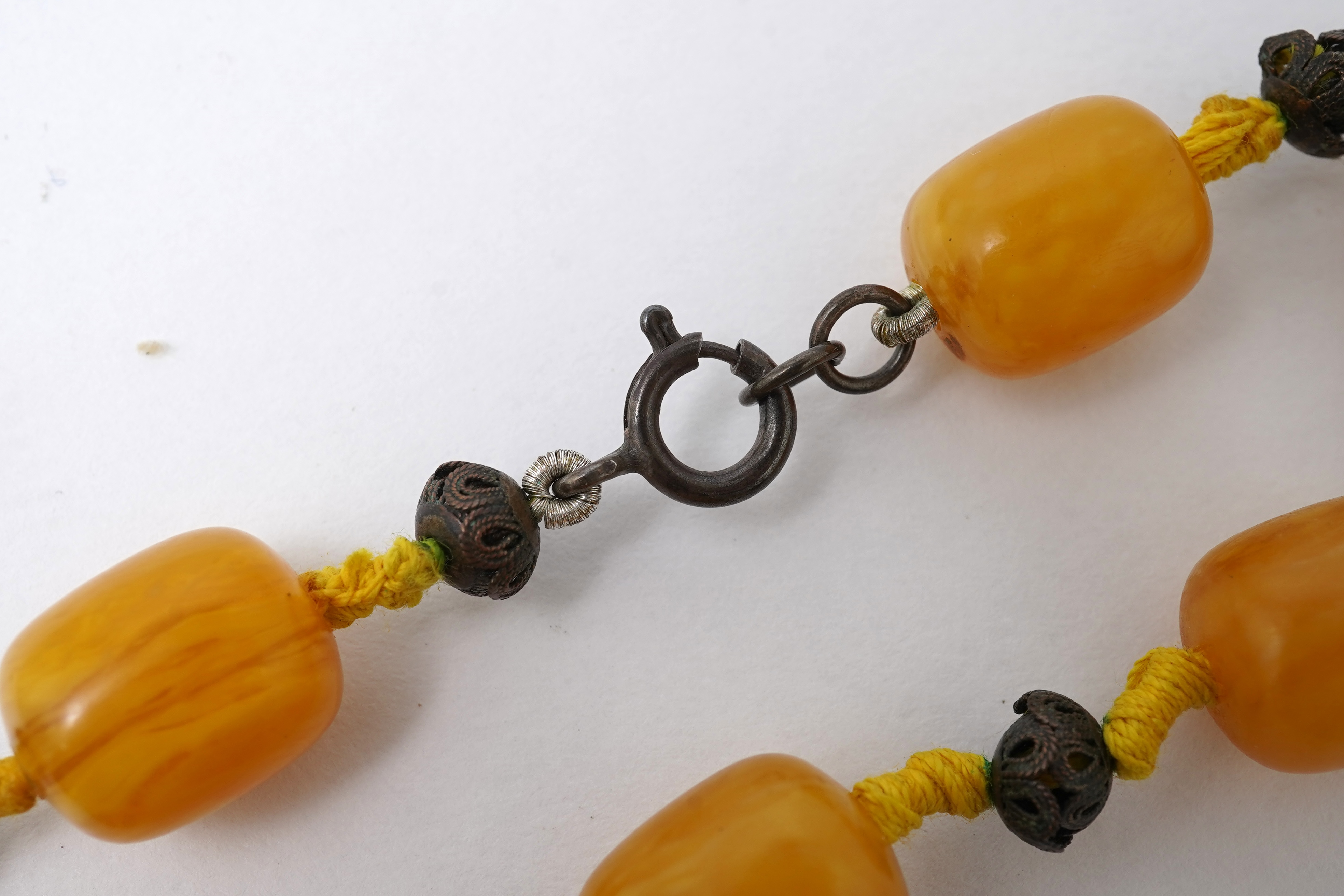 Lot 3012 , An amber necklace and carving, comprising: an amber necklace, composed of beads each measuring approximately 12 x 12 x 14mm, spaced by openwork metal beads, length 48cm; and an amber carving of a hawk on a rock, length 4