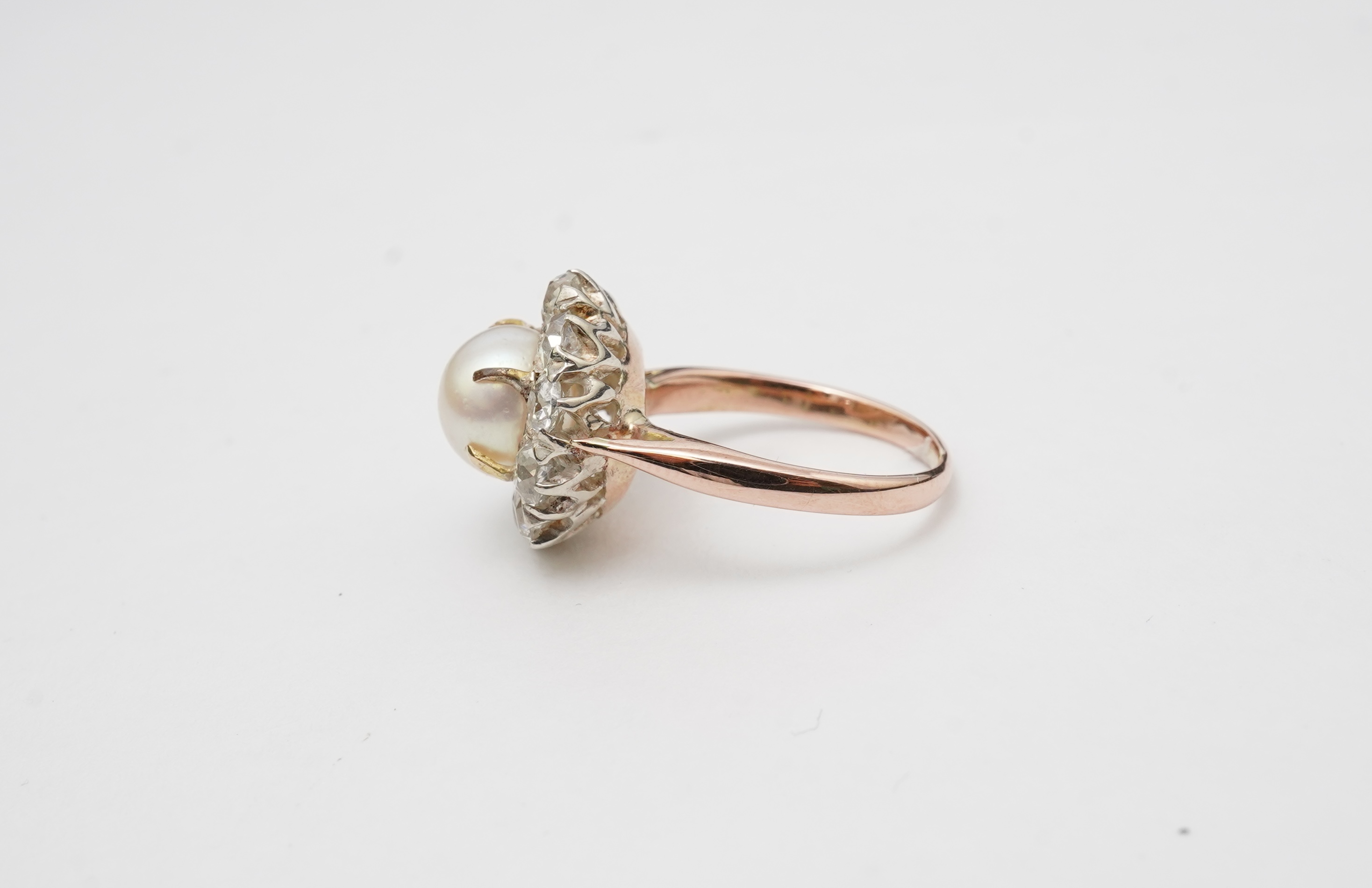 Cultured pearl later added, typical minor surface imperfections, blind drill hole, rotates in mount. Diamonds bright and lively, attractive antique old mine cuts. Cluster approximately 12mm diameter. Overall in good condition, gross weight approximately 3 grams.