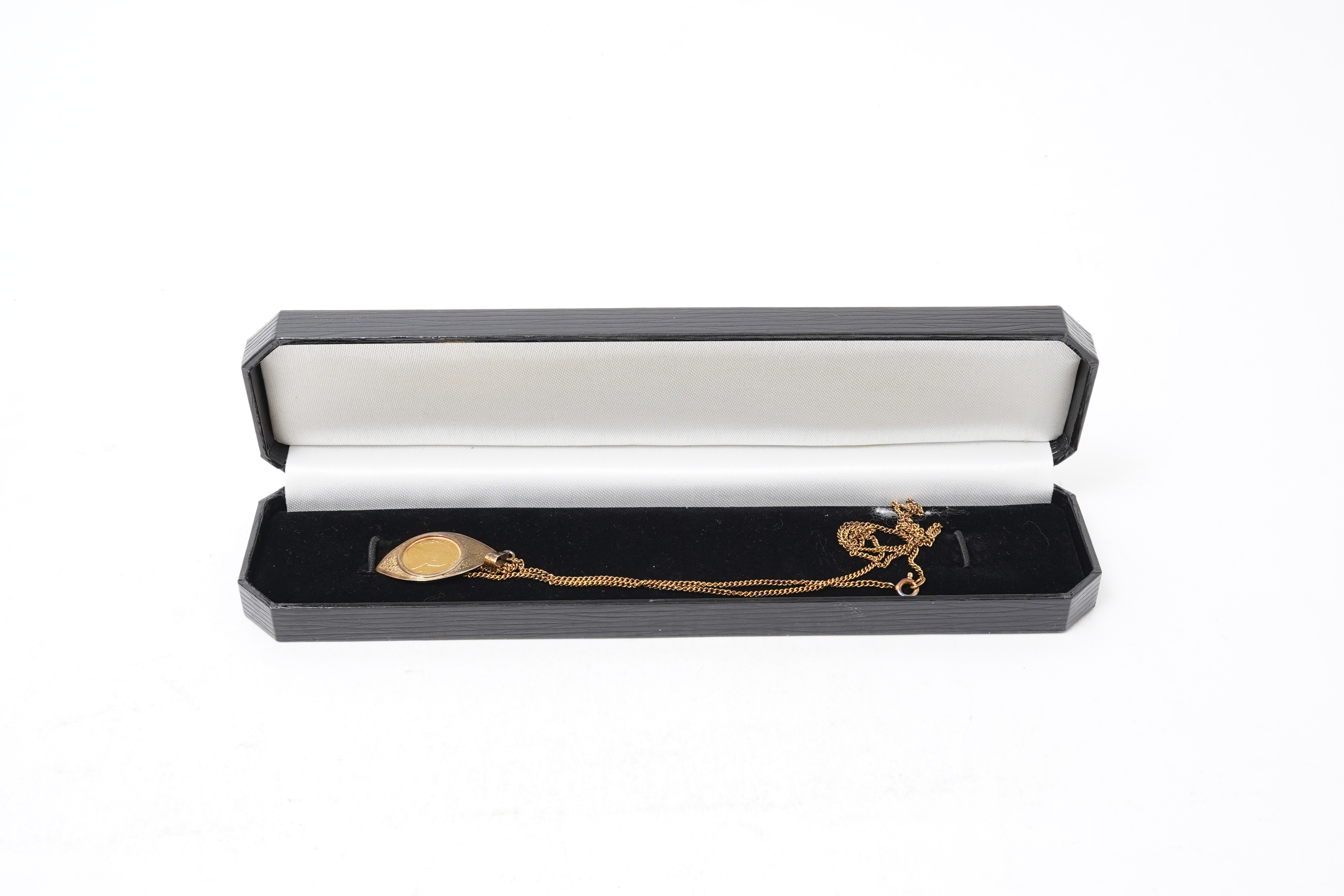 A gold 1/10 Krugerrand coin necklace, circa 1988 and later, the navette-shaped gold pendant set with a 1/10 gold Krugerrand coin dated 1988, to a curb chain necklace, pendant length 4cm, chain length 56cm, pendant stamped 9CT, chain stamped C18, combined gross weight approximately 11 grams