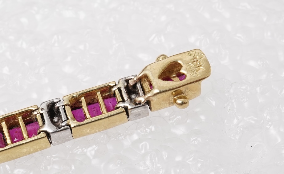 A ruby and diamond bracelet and pendant, comprising: a bracelet, composed of articulated links channel-set with calibré-cut rubies, spaced by links set with pairs of brilliant-cut diamonds, mounted in bicoloured gold, length 17.5cm, stamped 750; and a pendant of similar design, length 1.8cm including bail