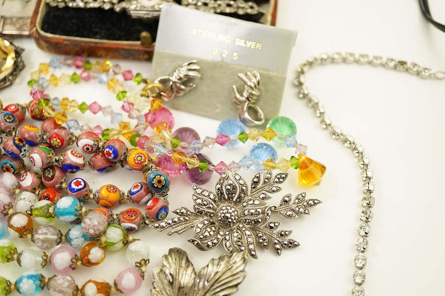 A collection of costume jewels, comprising: a charm bracelet suspending a series of charms, some in silver; a silver pencil; a sycamore leaf brooch; a pair of earrings of knotted design; an Art Deco paste watch; a gilt metal open-faced fob watch; a yellow paste pedant; a cultured pearl necklace; a pair of simulant pearl earrings; three paste necklaces and two millefiori glass bead necklaces