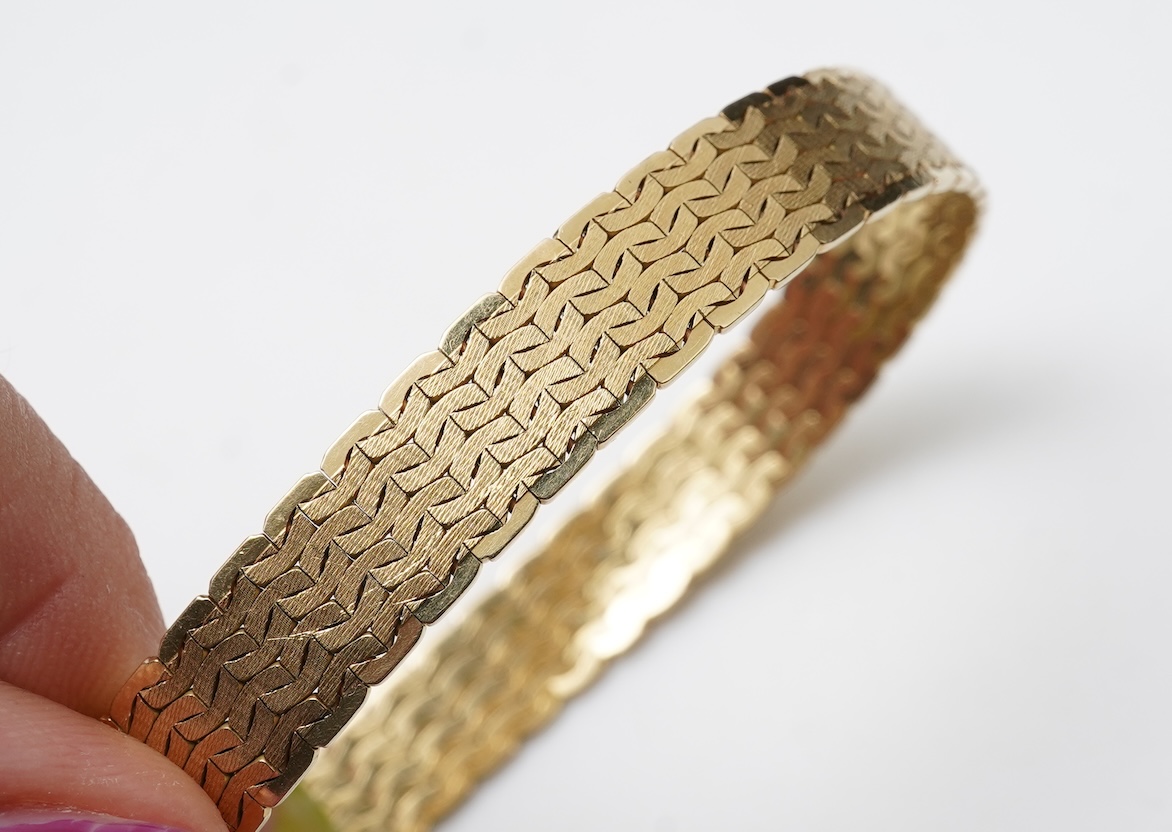 A gold bracelet, composed of flattened linking in 18ct gold, one side with an engraved finish, length 17.3cm, British import hallmarks, stamped 750, sponsor's mark S&S, gross weight approximately 20 grams