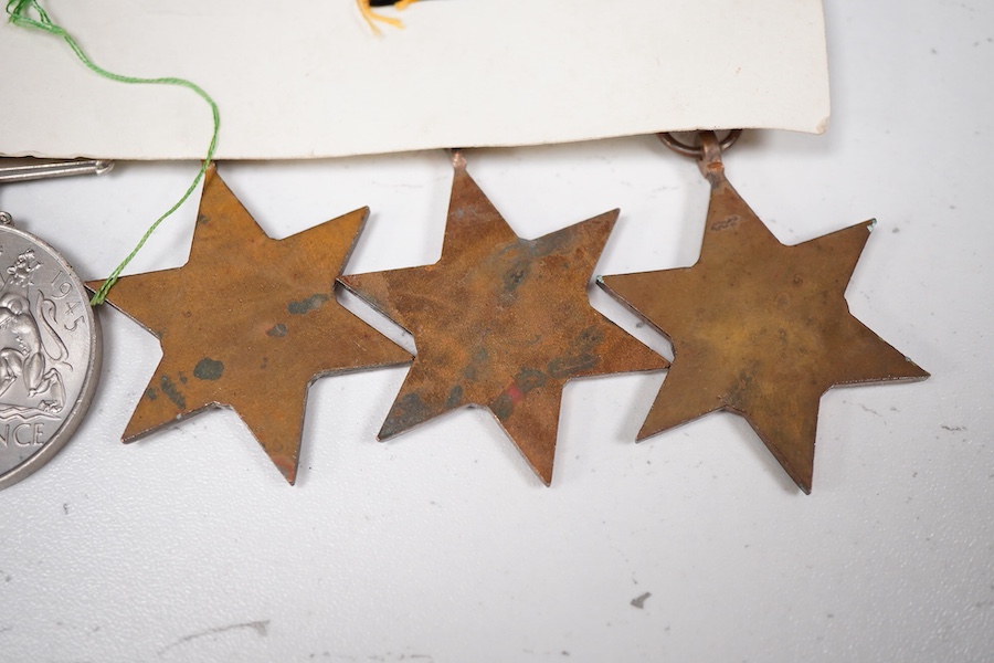 A WWII medal group of six medals, together with the official accompanying paper slip, comprising; the Air Crew Europe star with a clasp for France and Germany, the Africa star, the 1939-1945 star, etc., plus the GVI Air
