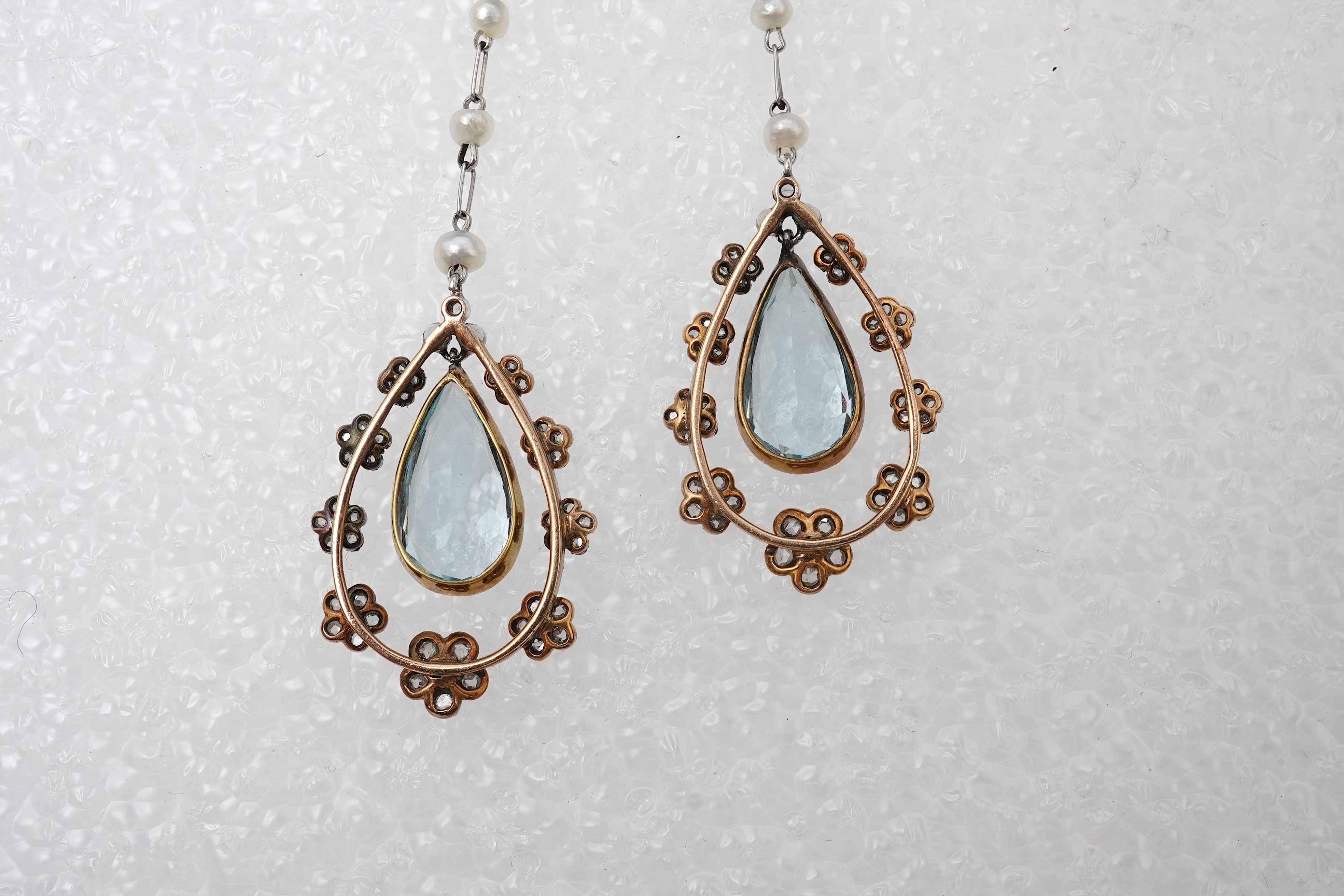 Retailed by Carrington & Co., a Belle Epoque aquamarine, seed pearl and diamond necklace, early 20th century of negligée design, designed as a floral crown suspending two pear-shaped aquamarine drops of asymmetrical length in floral frames, set with rose-cut diamonds, to a chain threaded with pearls measuring approximately 3mm diameter, mounted in gold and platinum, necklace length 42cm, pendant length 6.3cm, pearls untested, original fitted case stamped Carrington & Co., 130 Regent Street