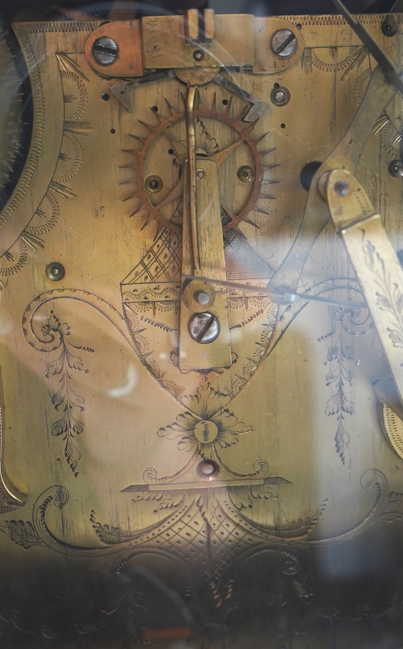 A substantial George III mahogany balloon-shaped musical bracket clock by George Bennett, Greenwich, ‘Clockmaker to the Royal Observatory’, signed and dated A.D. 1763 on an inset enamel panel above the dial, ormolu mounts and curved pad top, pierced brass fretwork panels to the sides with brass carrying handles above, gilt dial with inset enamelled numerals and separate seconds dial, painted dial plate with automaton scene within the arched top, including moving rowing boats, windmill with turning sails, and horse and cart with miller delivering grain to the windmill, three train eight day fusee movement with anchor escapement and substantial engraved back plate, four pillar movement striking on a bell and chiming on a further thirteen bells, with tune selector to the dial featuring six alternative airs, pull repeat and strike & chime/silent selector, 56.5cm high