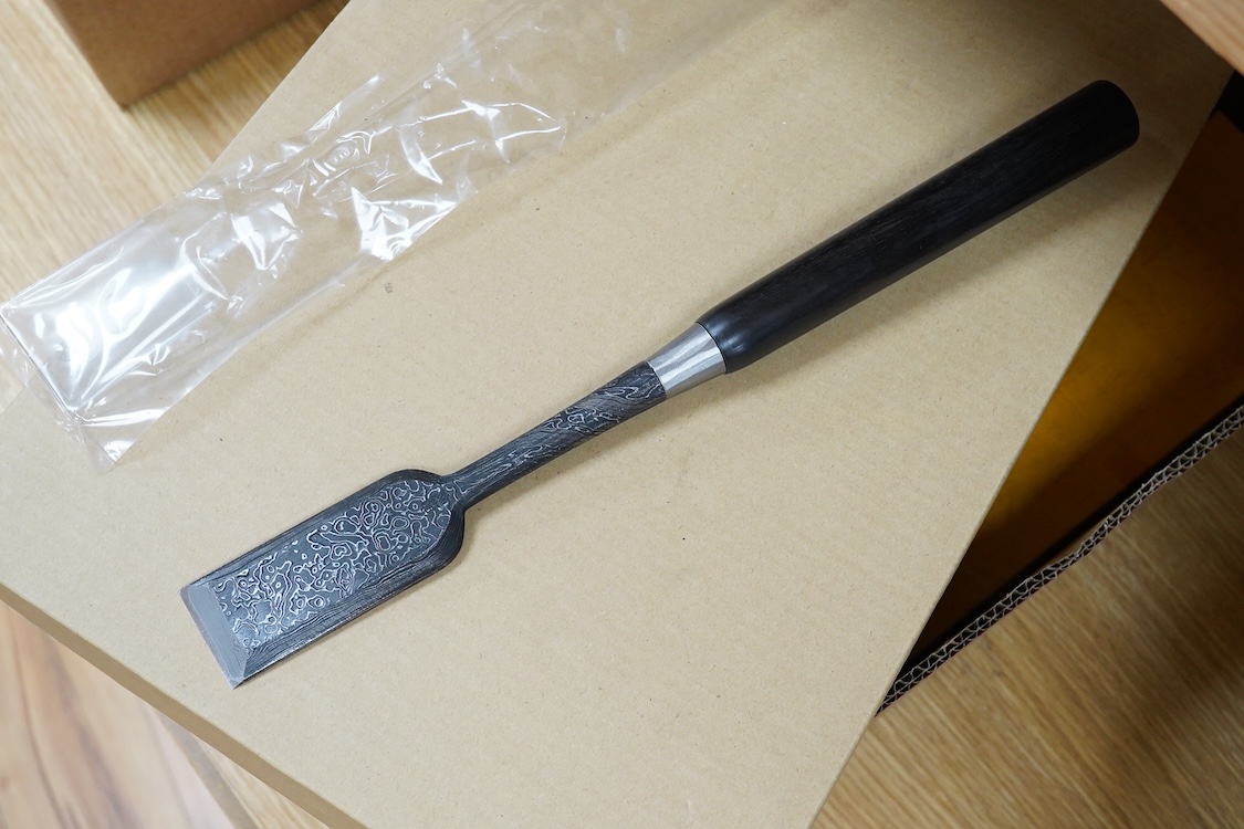 Lot 2309 , Two wood cased Japanese woodworking chisel sets, a timber framing set of five chisels and a 10 piece set of smaller chisels, both in fitted boxes, together with three small Japanese hammers