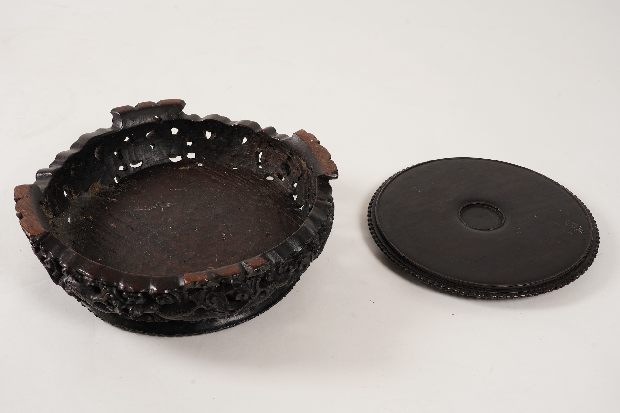 An impressive Chinese hongmu ‘dragon’ stand, late 19th century, the swivel dish top with groove probably for a glass dome (now lacking), the lower section carved in relief and openwork with dragons chasing a flaming pearl amid clouds, 40.5cm wide x 15cm high