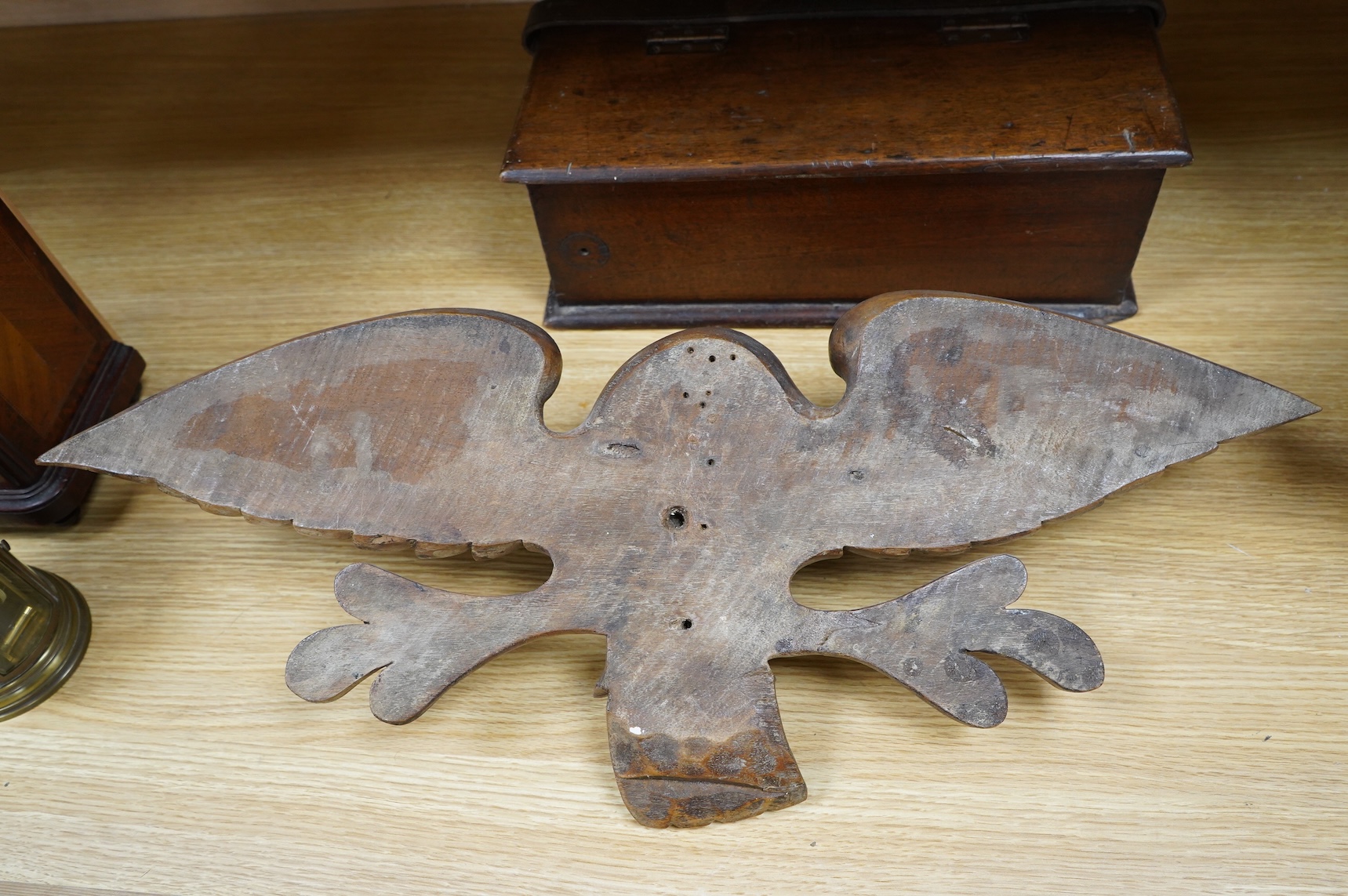 Lot 445 , A mahogany leather-handled tool box and carved American eagle wall mount, largest 66cm wide