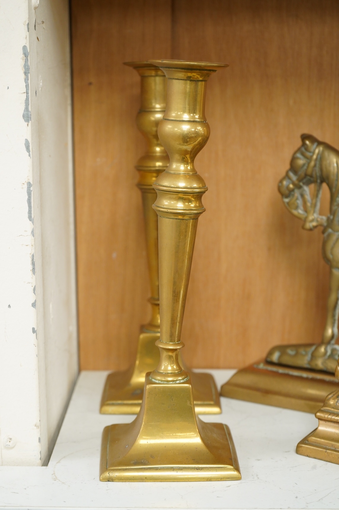 A bronze figure of a horse, two pairs of brass doorstops and a similar pair of candlesticks, 25cm