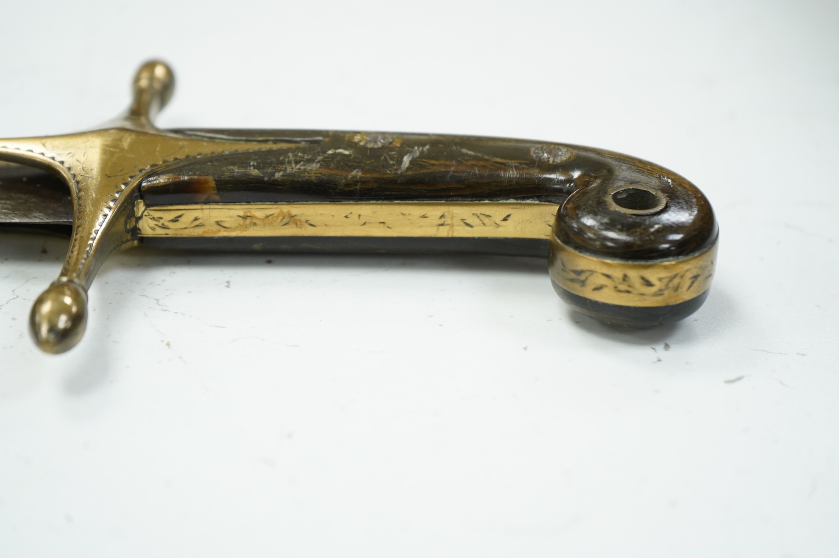 An Ottoman sword kilij with rounded back edge, traces of gold cartouche to the blade, brass cross piece, and two-piece horn grip, blade approximately 76cm