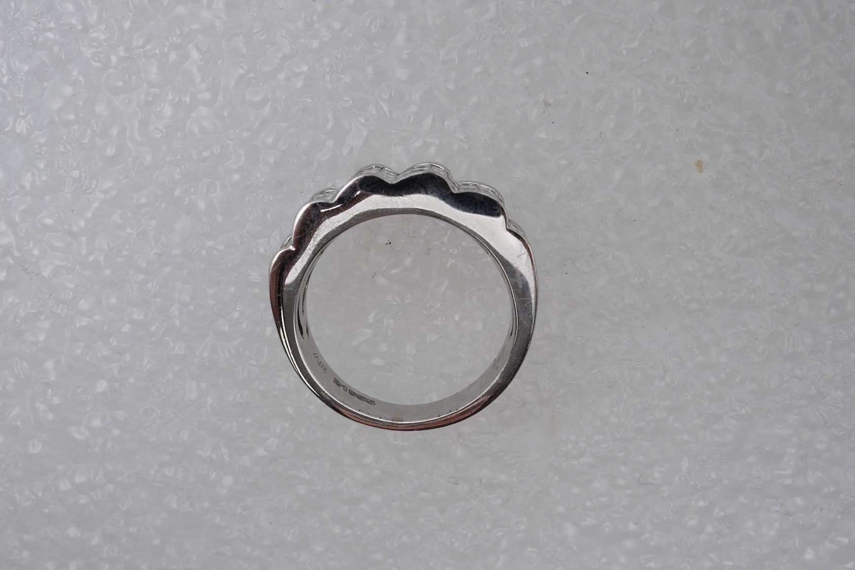 A diamond dress ring, the front of undulating design, invisibly set with princess-cut diamonds totalling approximately 2.00 carats, mounted in white gold, size O, stamped 750, maker's mark AK, numbered 21955, gross weight approximately 8 grams