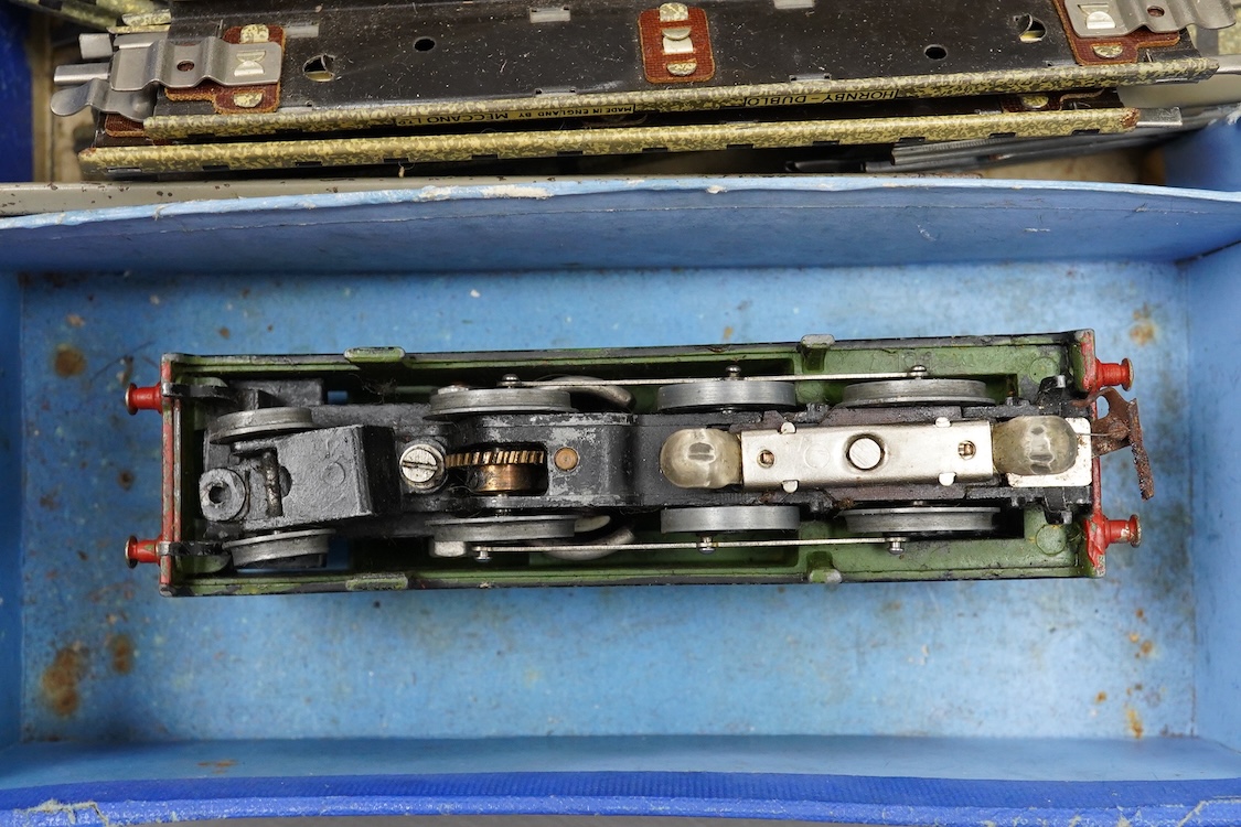 A small collection of Hornby Dublo railway for 3-rail running, including; an LNER class N2, 0-6-2T locomotive, 9596, in green livery, together with two bogie coaches, an open wagon, a D1 level crossing and a selection of track sections, contained within a box for an EDG7 Tank Goods Train set